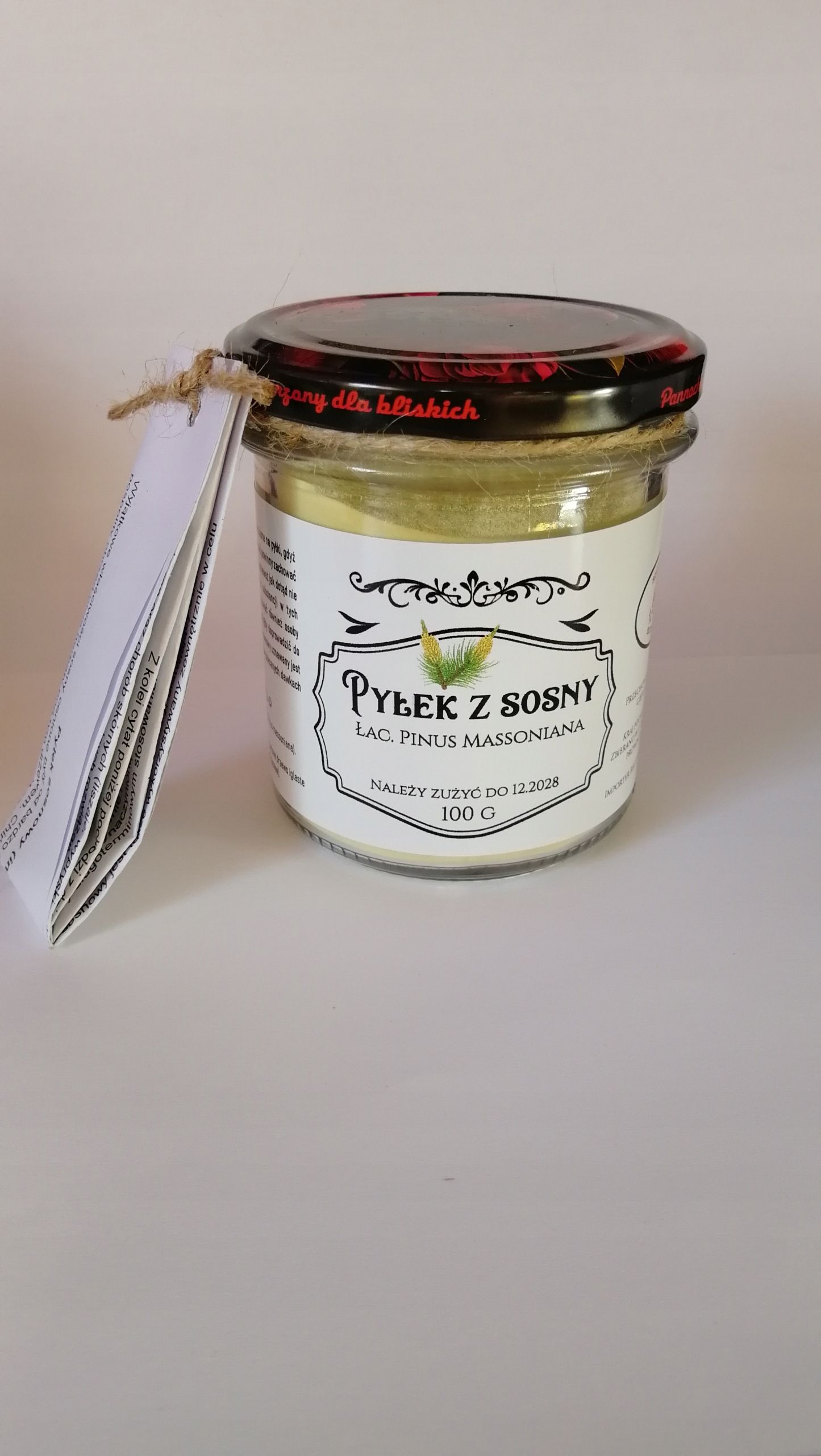 Pakowanie : pyłek z sosny pakowany jest w szklany słoik dzięki czemu żadne chemiczne składniki toreb foliowych czy opakowań plastikowych nie przedostaną się do idealnie czystego pyłku z sosny. Szklany pojemnik postawiony w ciepłym i suchym miejscu jest najlepszy do przechowywania pyłku - papierowa torba "łapie" wilgoć i nie jest wskazana.