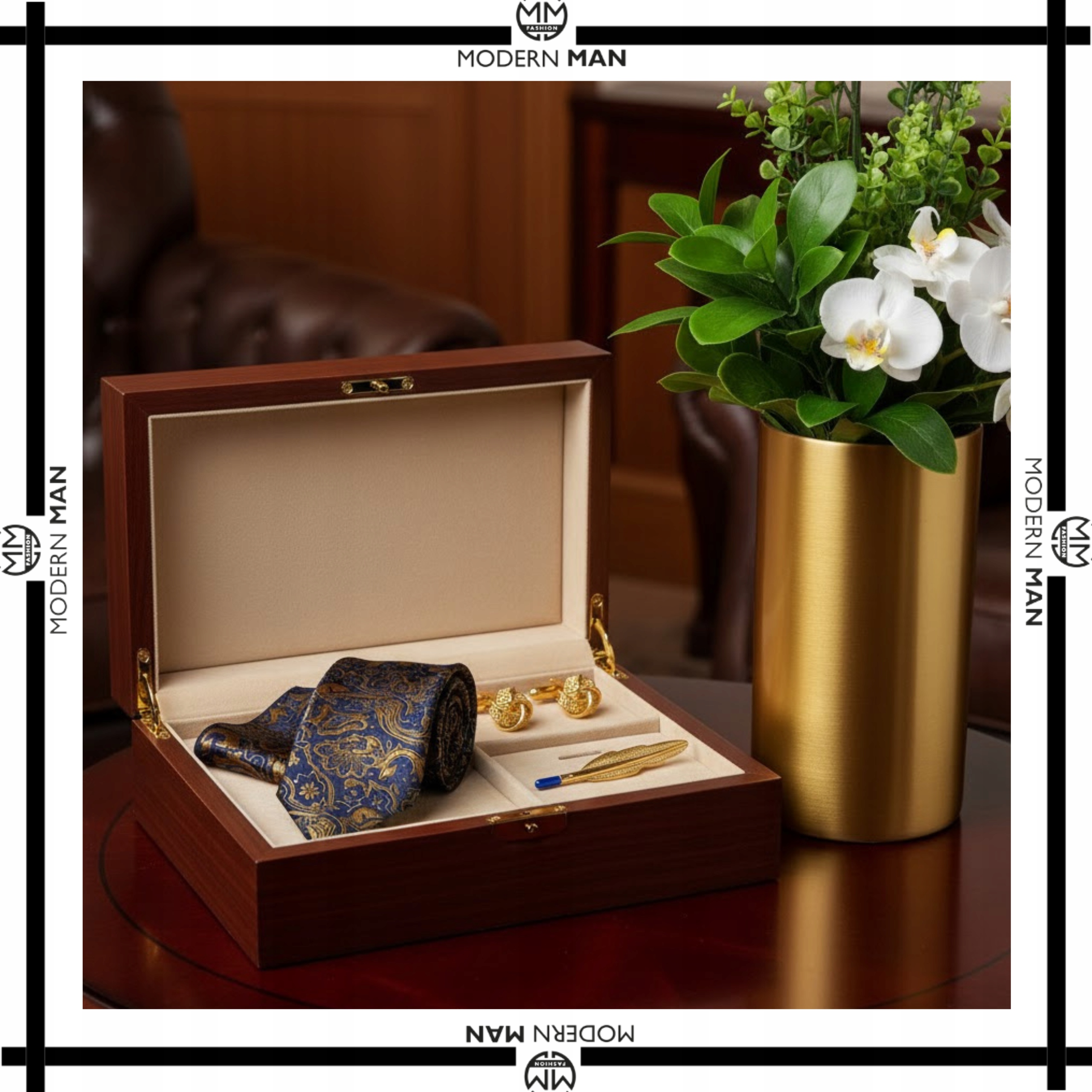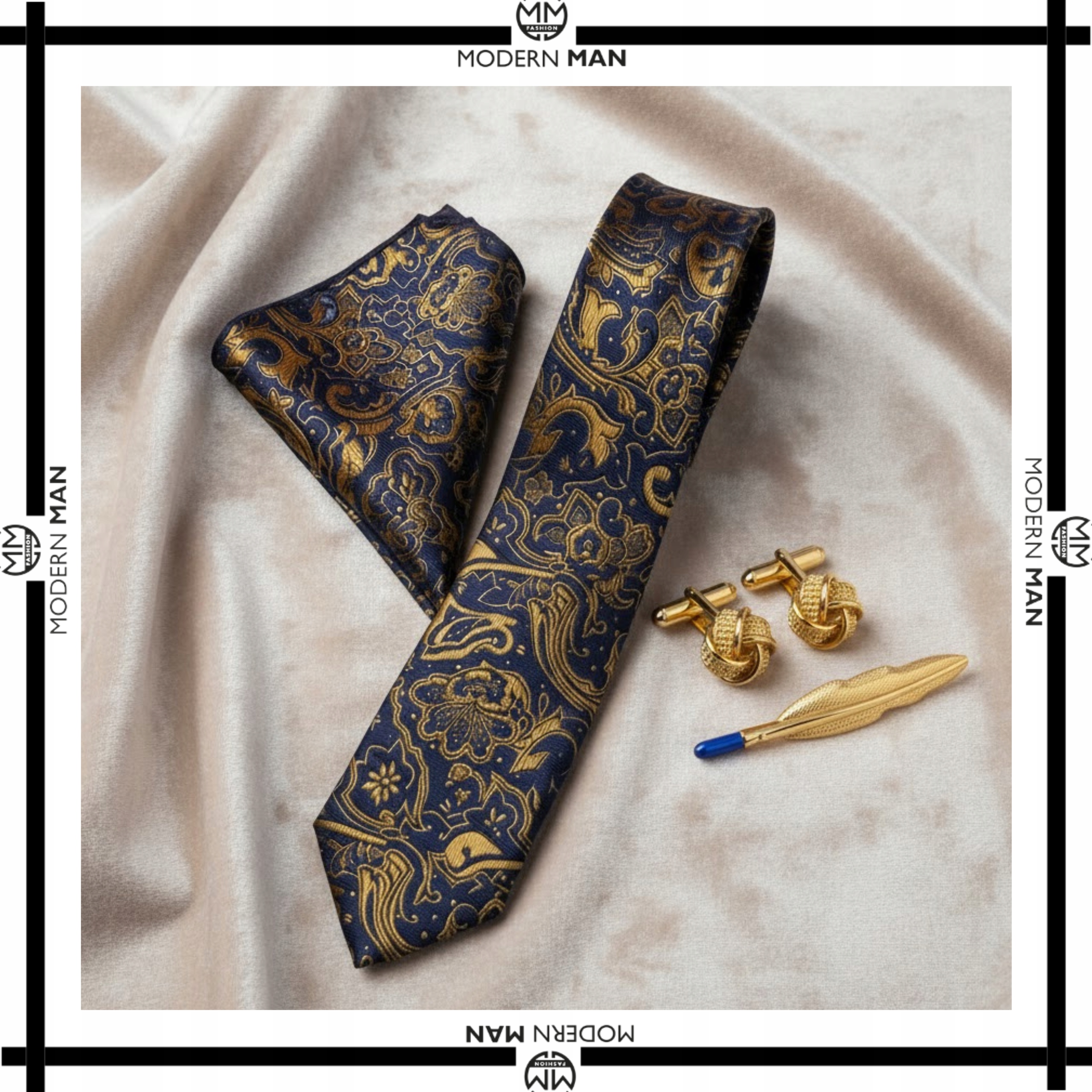 ✅Stylowy, kompletny zestaw męskich dodatków, który robi wrażenie już od pierwszego spojrzenia. Krawat w kolorze granatowo-złotym w połączeniu z poszetką, spinkami do mankietów i spinką do krawata tworzy spójną, elegancką całość. Każdy element został starannie dobrany, by podkreślić szyk i nowoczesność męskiej stylizacji. Całość zamknięta jest w eleganckim pudełku prezentowym, co czyni ten zestaw gotowym do wręczenia upominkiem – bez dodatkowego pakowania. To doskonały wybór dla mężczyzn, którzy chcą wyglądać stylowo i czuć się pewnie w każdej sytuacji – od ślubu po biznesowe spotkanie.