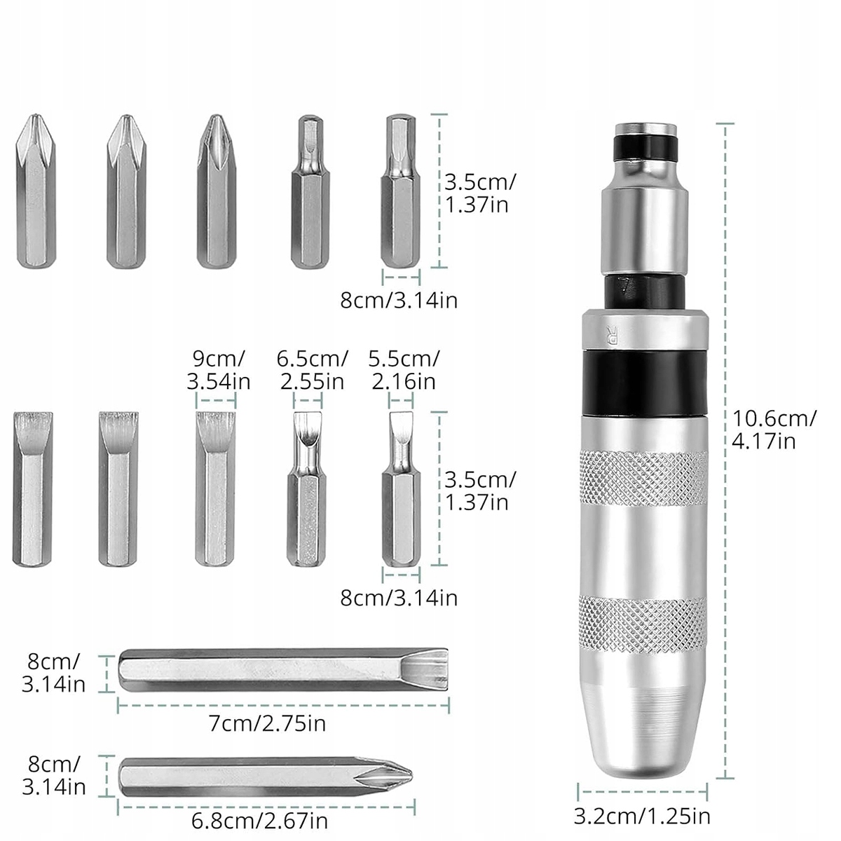 Zestaw zawiera trzy różne rodzaje bitów: śrubokręt płaski, śrubokręt krzyżakowy i śrubokręt imbusowy, łącznie 12 elementów, które w dużej mierze zaspokoją Twoje potrzeby.