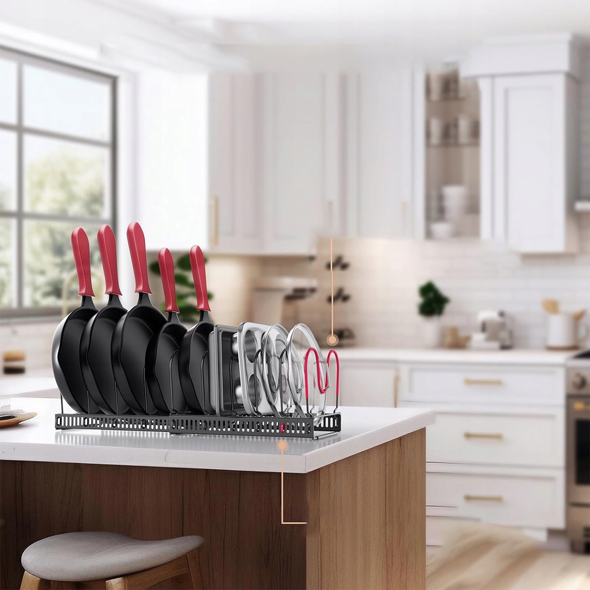 utrzymywanie porządku w szafie i oszczędzanie miejsca. Idealny do przechowywania patelni, pokrywek, talerzy i desek do krojenia pod blatami, szafkami, a nawet pod zlewem.