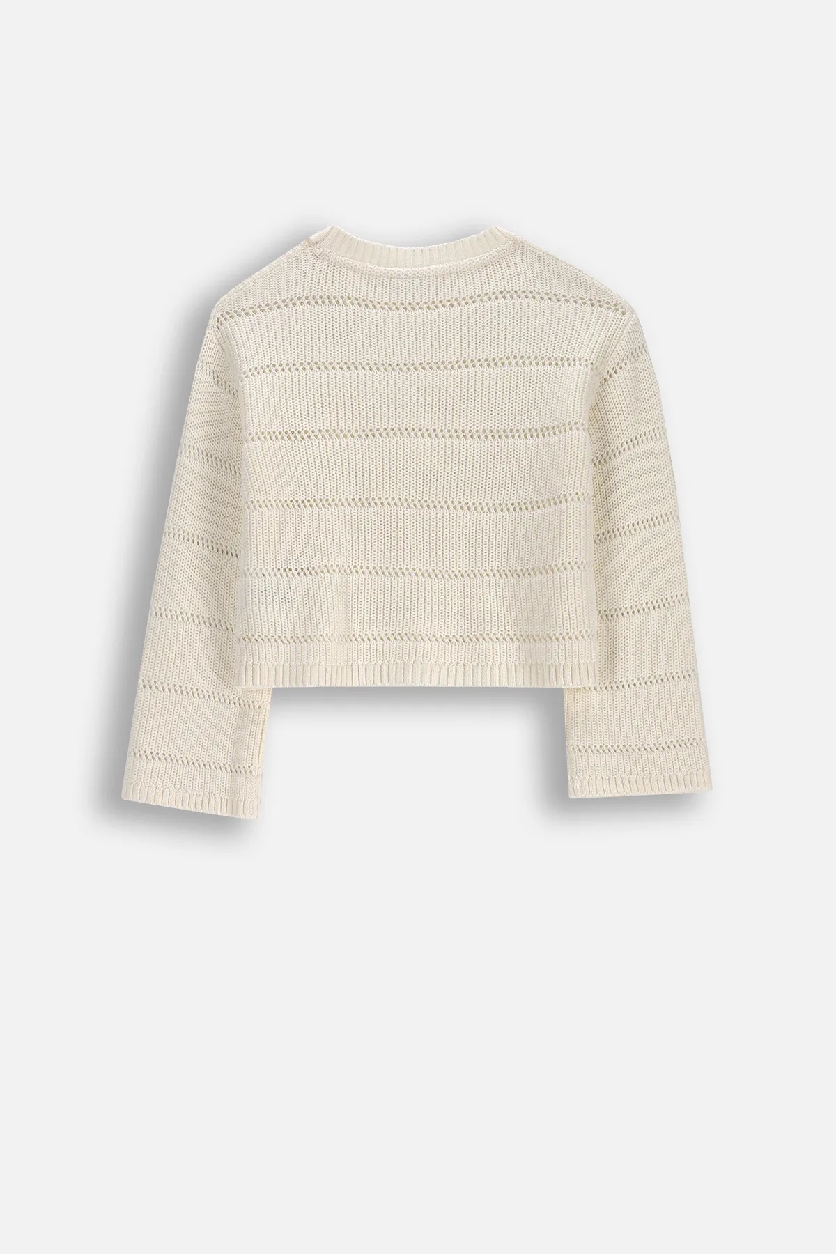 Odkryj elegancję i komfort w jednym dzięki naszemu swetrowi z ażurowym zdobieniem. Wykonany z delikatnej, grubej włóczki w kolorze ecru, ten sweter to idealny wybór na chłodniejsze dni. Jego zaokrąglony dekolt i długi rękaw zapewniają ciepło i wygodę, a jednocześnie pozwalają na swobodę ruchów.