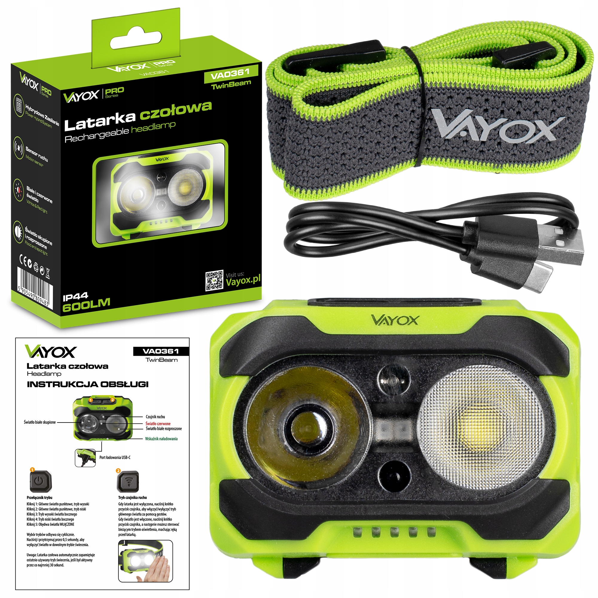 • AkumulatorKabel usb-c, Latarka VA0361, Opaska na głowę, Oryginalne opakowanie