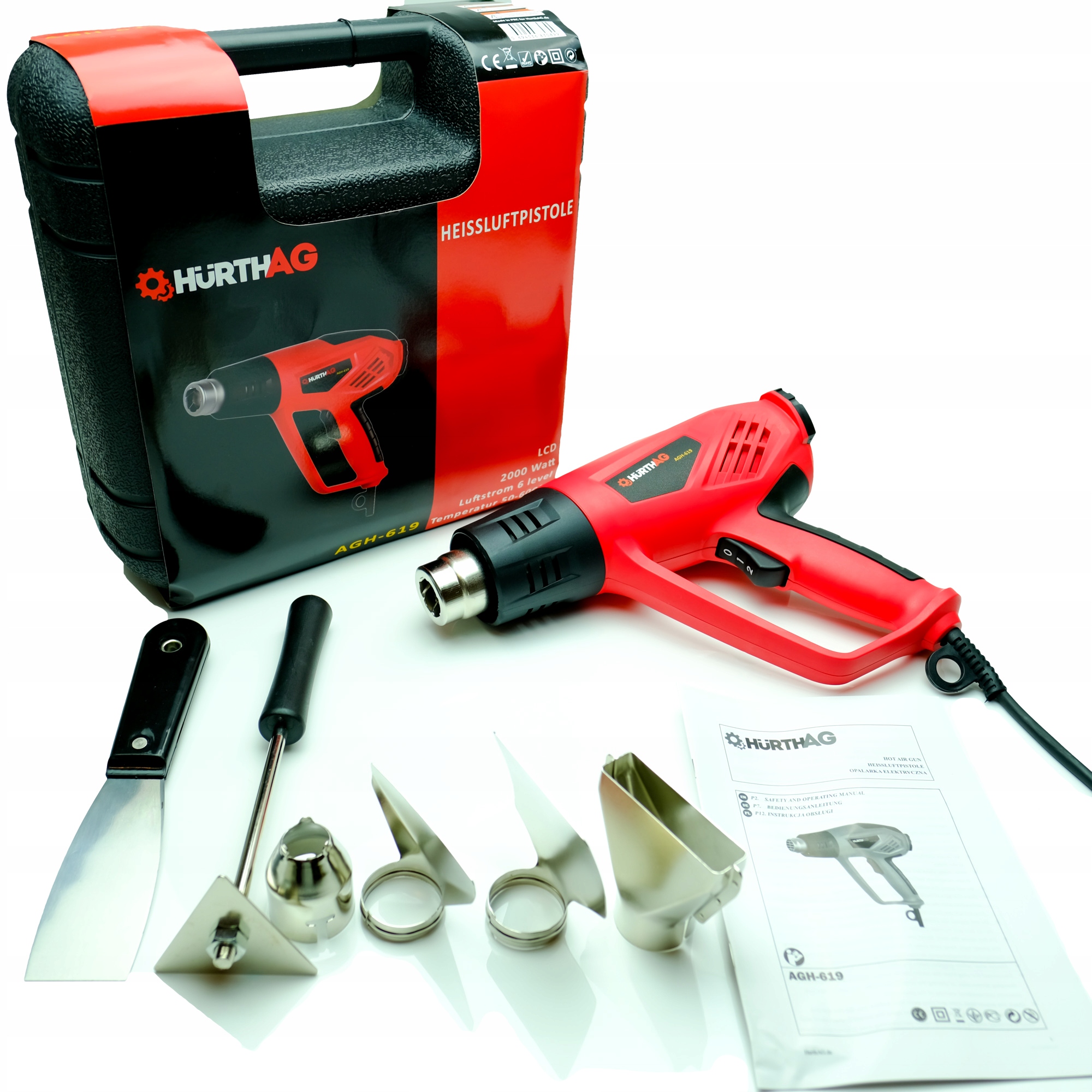 Тепловая пушка - это очень легкое устройство, предназначенное для: сушки, размораживания, удаления старого лакокрасочного покрытия, нанесения кромочных шпонов, экструзии термоусадочных пленок и т. д. Устройство он имеет шестиступенчатую регулировку воздушного потока и цифровую плавную регулировку температуры с ЖК-дисплей. В комплект входят 4 насадки, 2 скребка и удобный чехол.