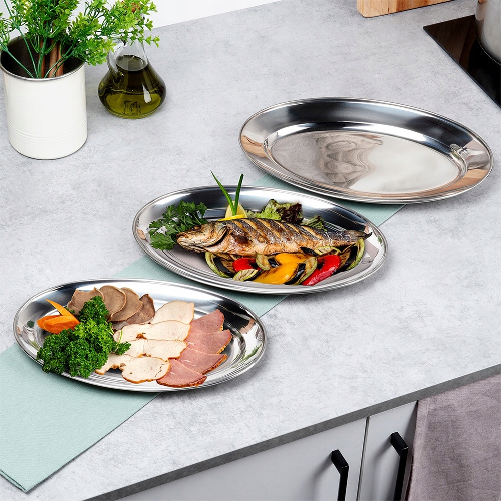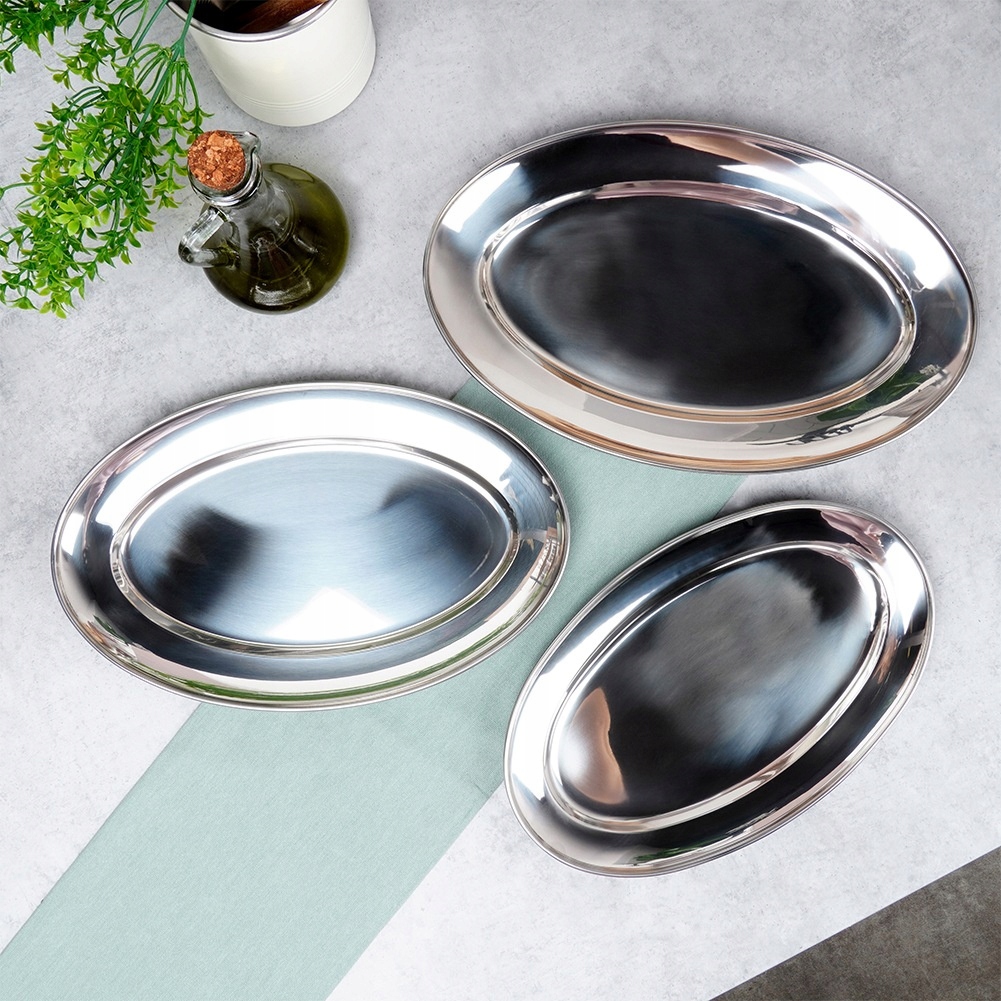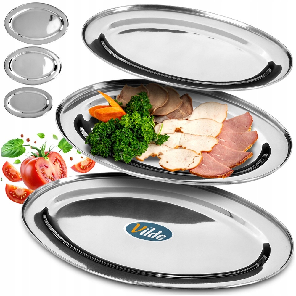 Zestaw 3 szt. półmisków - Zestaw trzech tac do serwowania przekąsek, przystawek, dań, kanapek. Każda z tac jest w owalnym kształcie. Duża taca ma wymiary 34 x 21,5 cm, średnia taca ma wymiary 32 x 20 cm, mała taca ma wymiary 29 x 18 cm. Wykonane ze stali nierdzewnej - Wykonane z najwyższej jakości stali nierdzewnej w srebrnym kolorze. Polerowane na wysoki połysk. Uniwersalne zastosowanie - Tace będą przydatne zarówno w użytku domowym, jak i w gastronomii. Wykorzystamy je podczas przyjęć oraz spotkań rodzinnych. W wygodny sposób możemy zaserwować na nich dania, owoce lub przekąski. Solidne i wytrzymałe - Tace są wytrzymałe i stabilne, nie wyginają się pod ciężarem potraw, co zapewnia komfort użytkowania. Klasyczny styl - Ponadczasowy styl tac będzie idealnie komponował się z pozostałą zastawą stołową. Tace prezentują się estetycznie na każdym stole. Zestaw trzech tac do serwowania w owalnym kształcie. Nadają się do podawania różnego rodzaju potraw, od mięs i serów po owoce i ciasta. Można je wykorzystać zarówno podczas codziennych posiłków, jak i eleganckich przyjęć. Oryginalny produkt marki Vilde. Wyprodukowano zgodnie z europejskimi standardami.