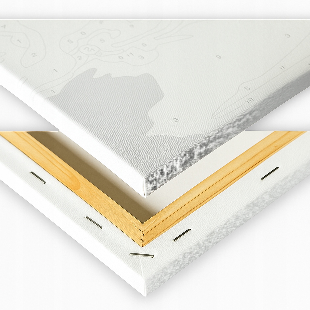 1. Płótno bawełniane 40x50 cm naciągnięte na drewnianą ramę (blejtram), z precyzyjnie nadrukowanym wzorem i numeracją segmentów do kolorowania