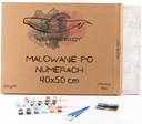 W komplecie otrzymujesz płótno o wymiarach 40x50 cm naciągnięte na drewnianą ramę, 24 farby akrylowe, 3 pędzle o różnych grubościach, haczyki do zawieszenia gotowego obrazu oraz polskojęzyczną instrukcję.