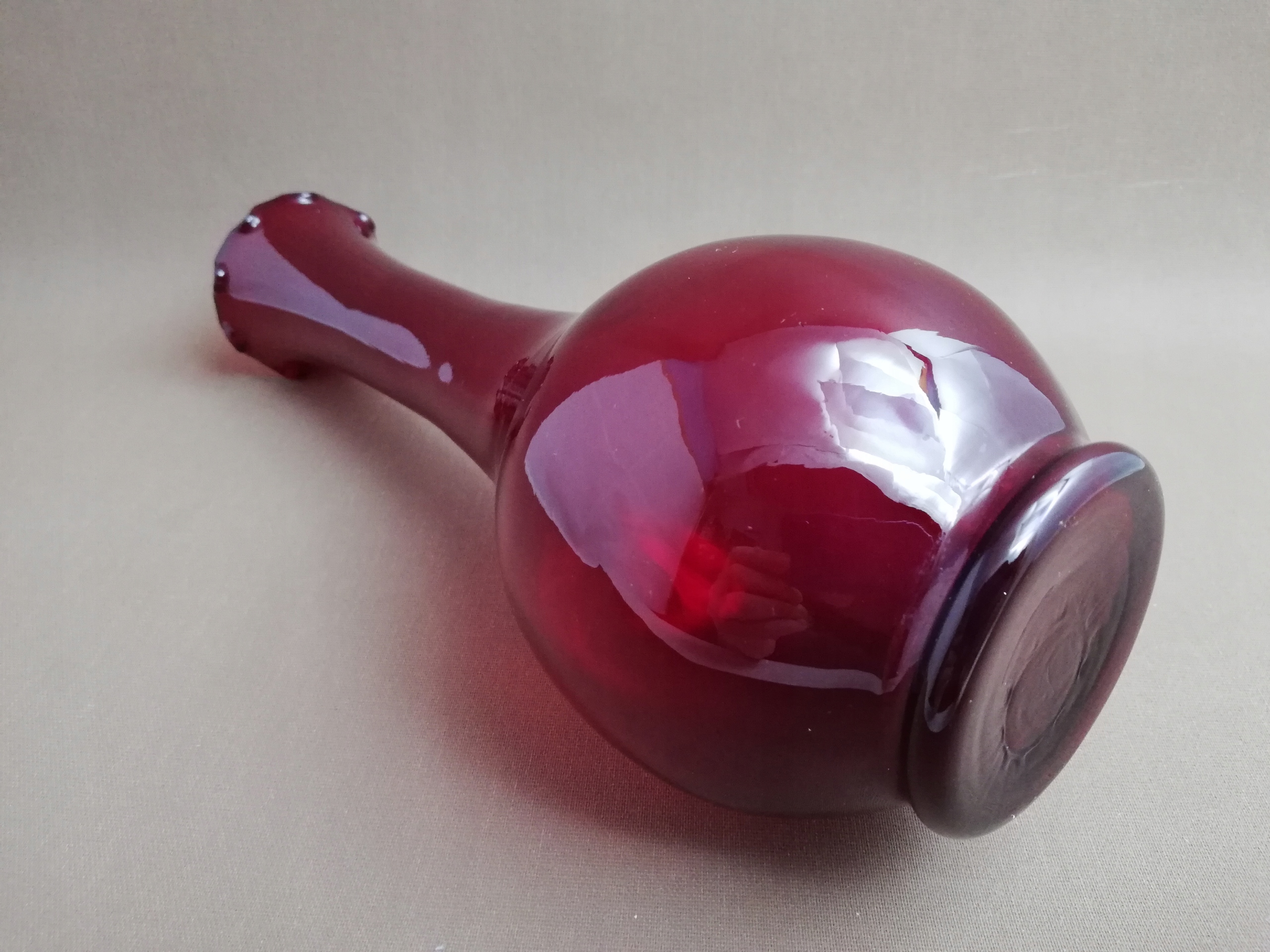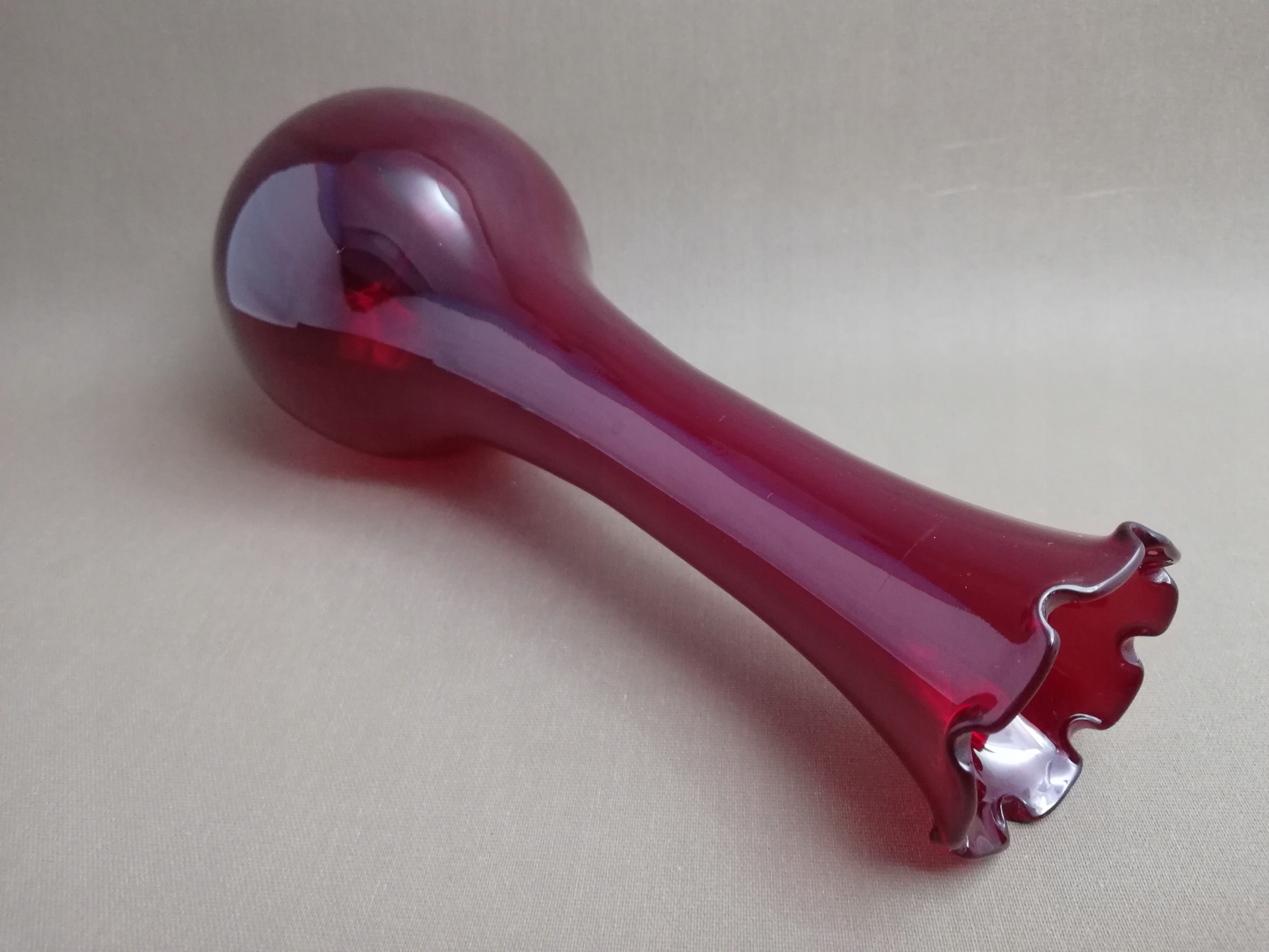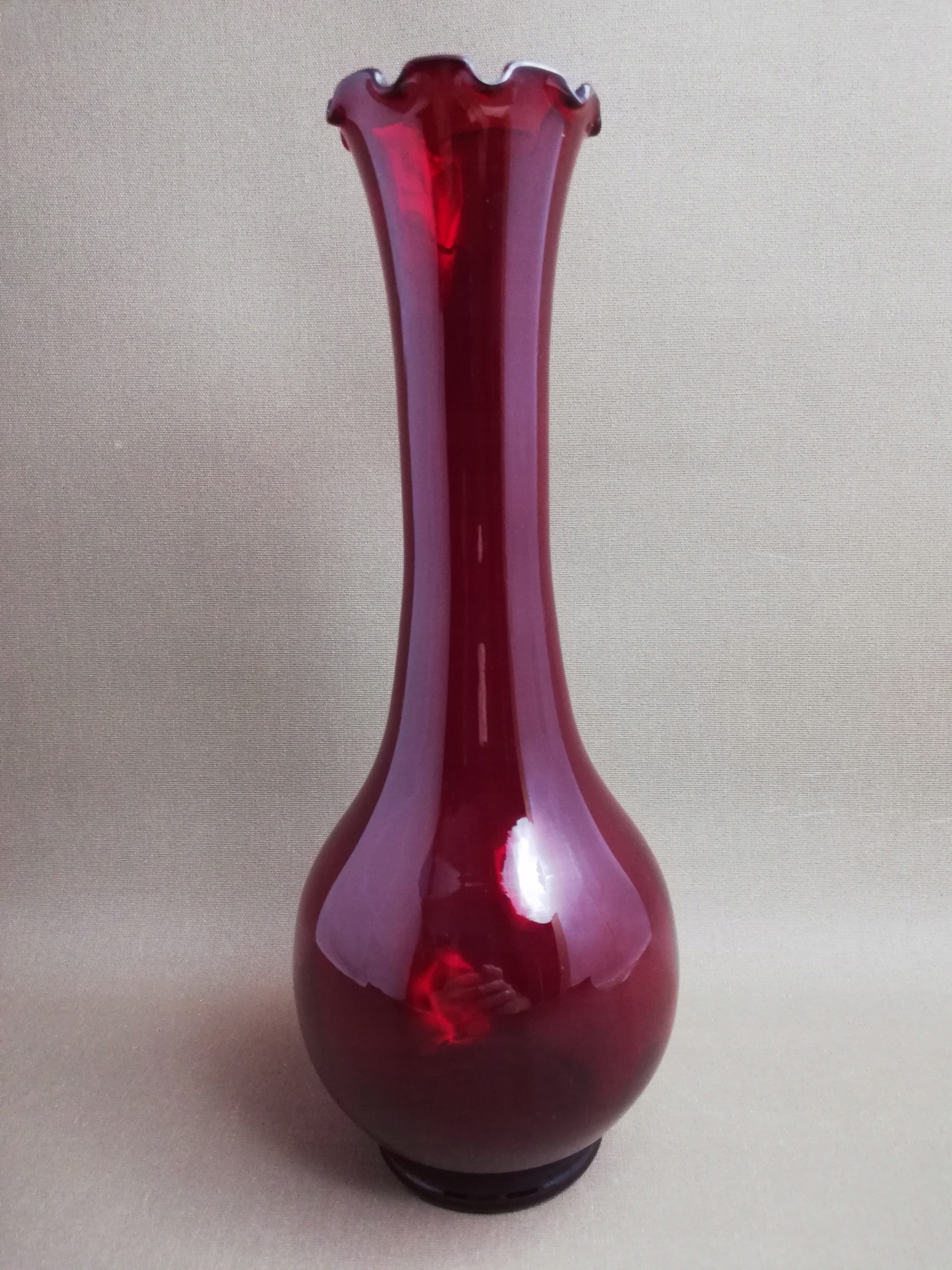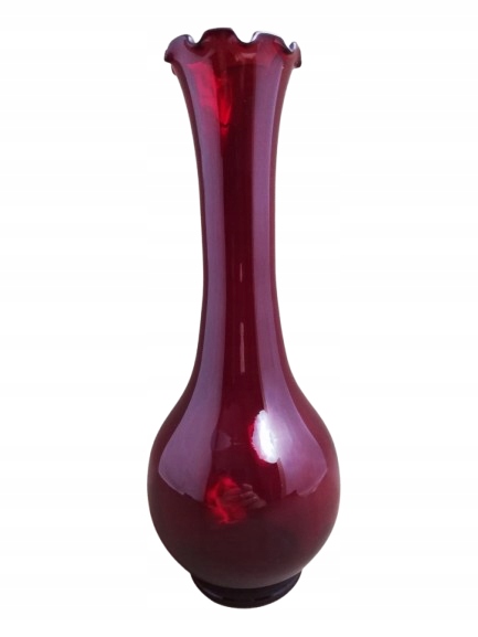 Stary kolekcjonerski wazon wykonany ze szkła barwionego w masie , o odcieniu ciemno-czerwonym / rubinowym, pochodzący z czasów Prl-u , huta szkła Ząbkowice , zdobiony falbanką