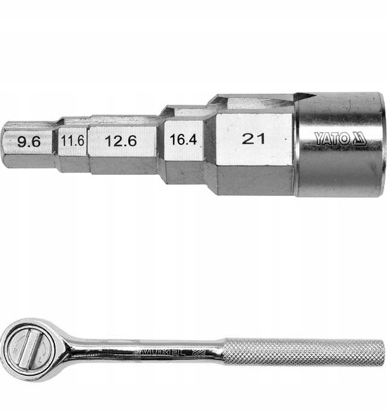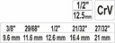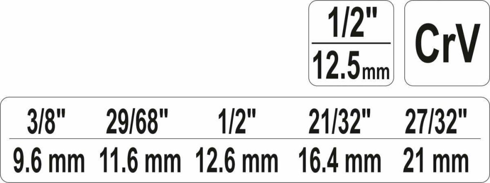 Klucz stopniowy o rozmiarach 3/8" (9,6 mm) / 29/68" (11,6 mm) / 1/2" (12,6 mm) / 21/32" (16,4 mm) / 27/32" (21 mm) z napędem 1/2" wykonany z wysokogatunkowej stali CRV. Po obu stronach posiada nacięcie przeznaczone do śrubunków z wypustkami.