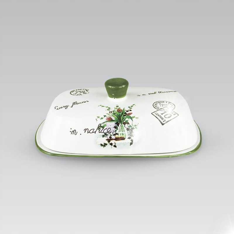 Керамика масельница марки Maestro MR20065-45. Масляная кастрюля из грубой керамики очень хорошего качества светло-кремового цвета с нежной зеленовато-оливковой растительностью и ручкой. В то время как на контейнере цветочная композиция и бронзовые надписи.