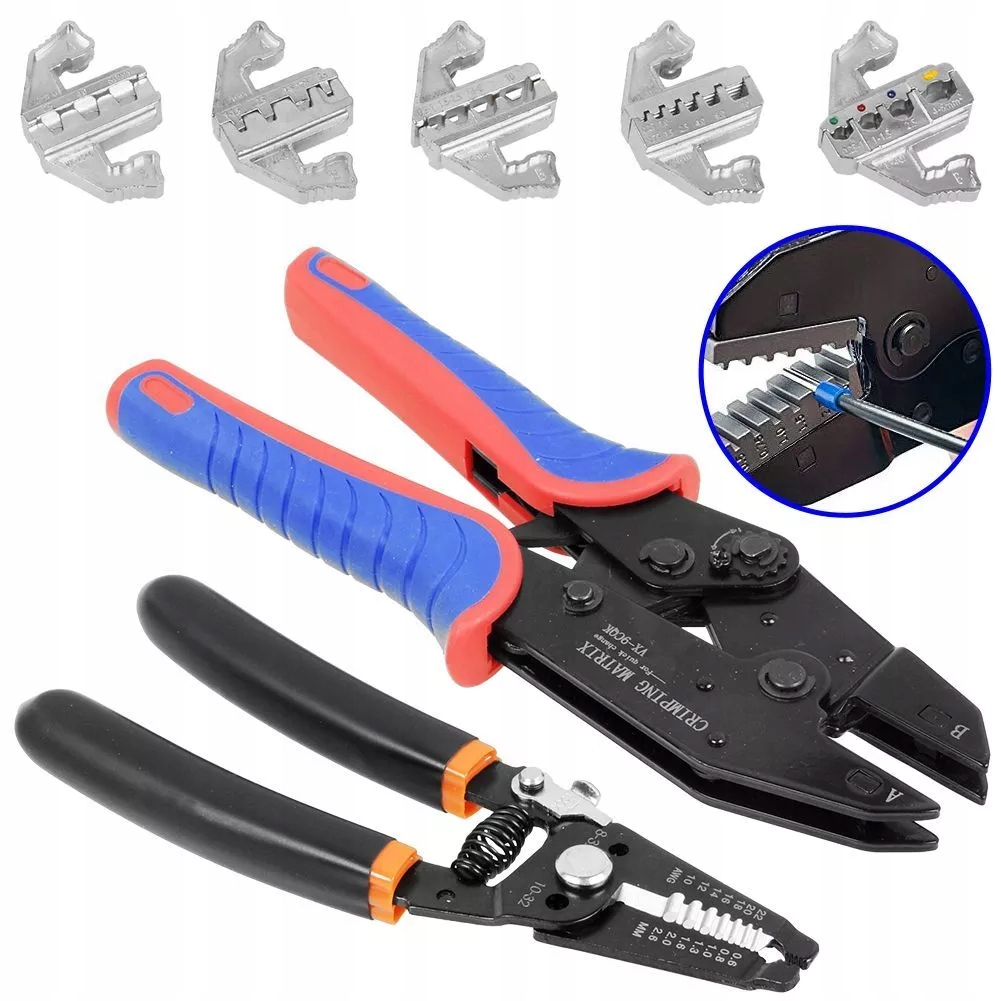 Zestaw narzędzi do zaciskania połączeń typu „wszystko w jednym” zawiera kompaktowe narzędzie do zaciskania, 5 szybkowymiennych matryc, narzędzie do ściągania izolacji i pudełko do przechowywania.