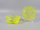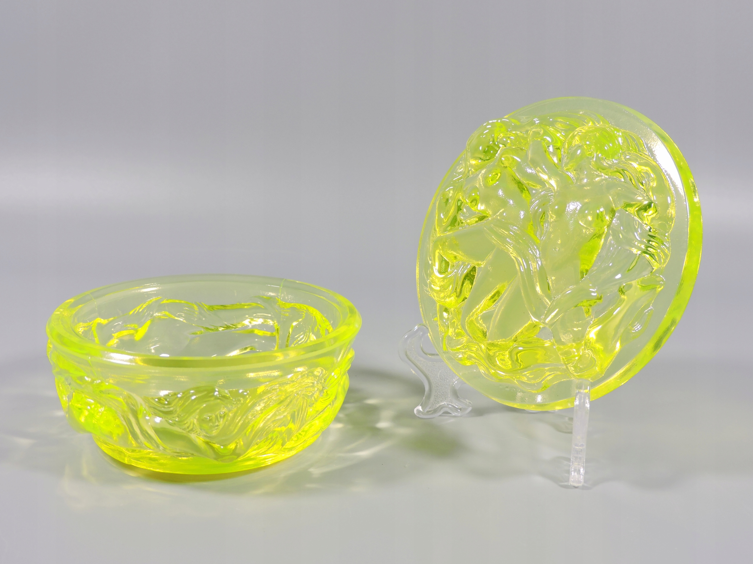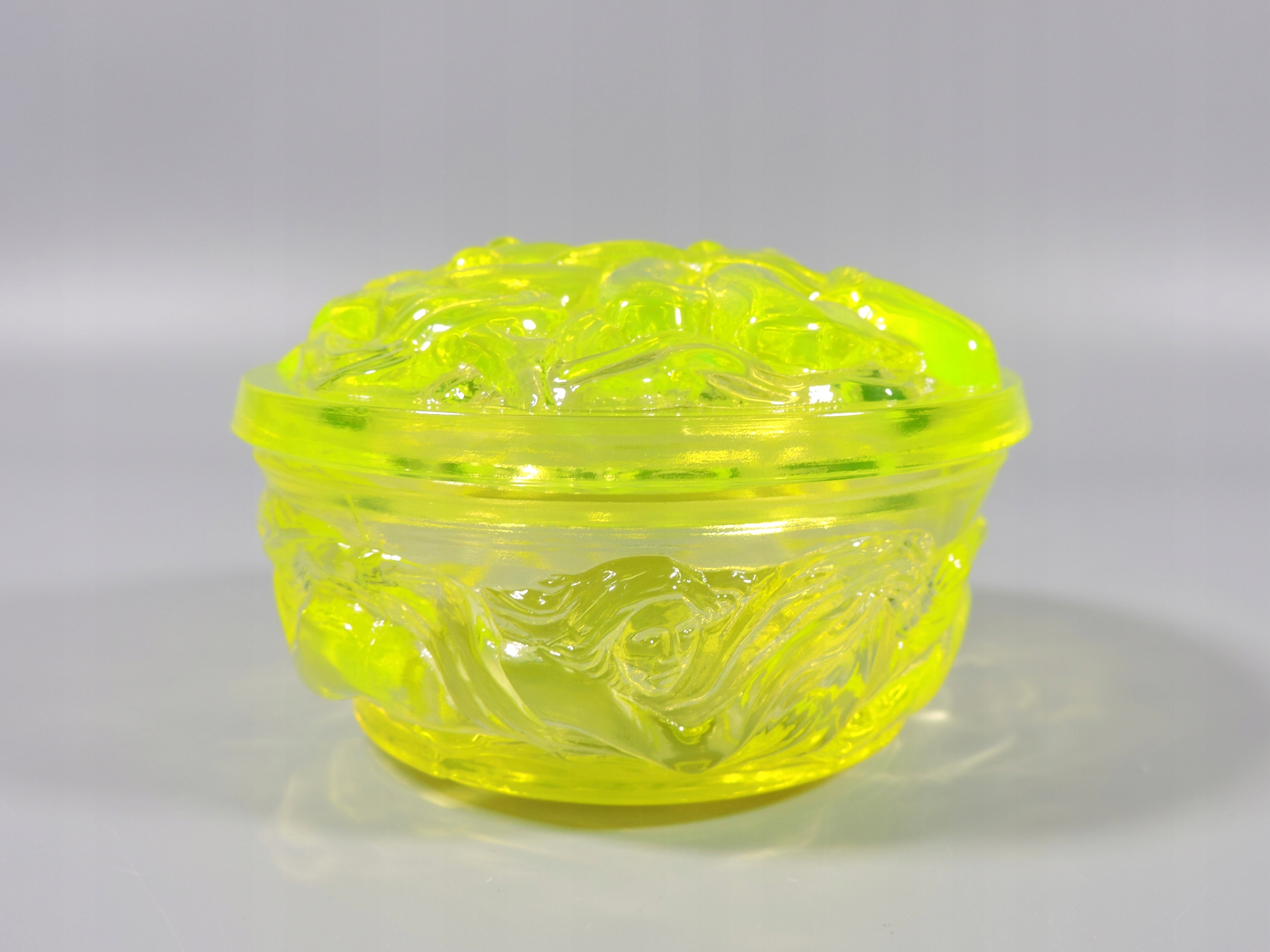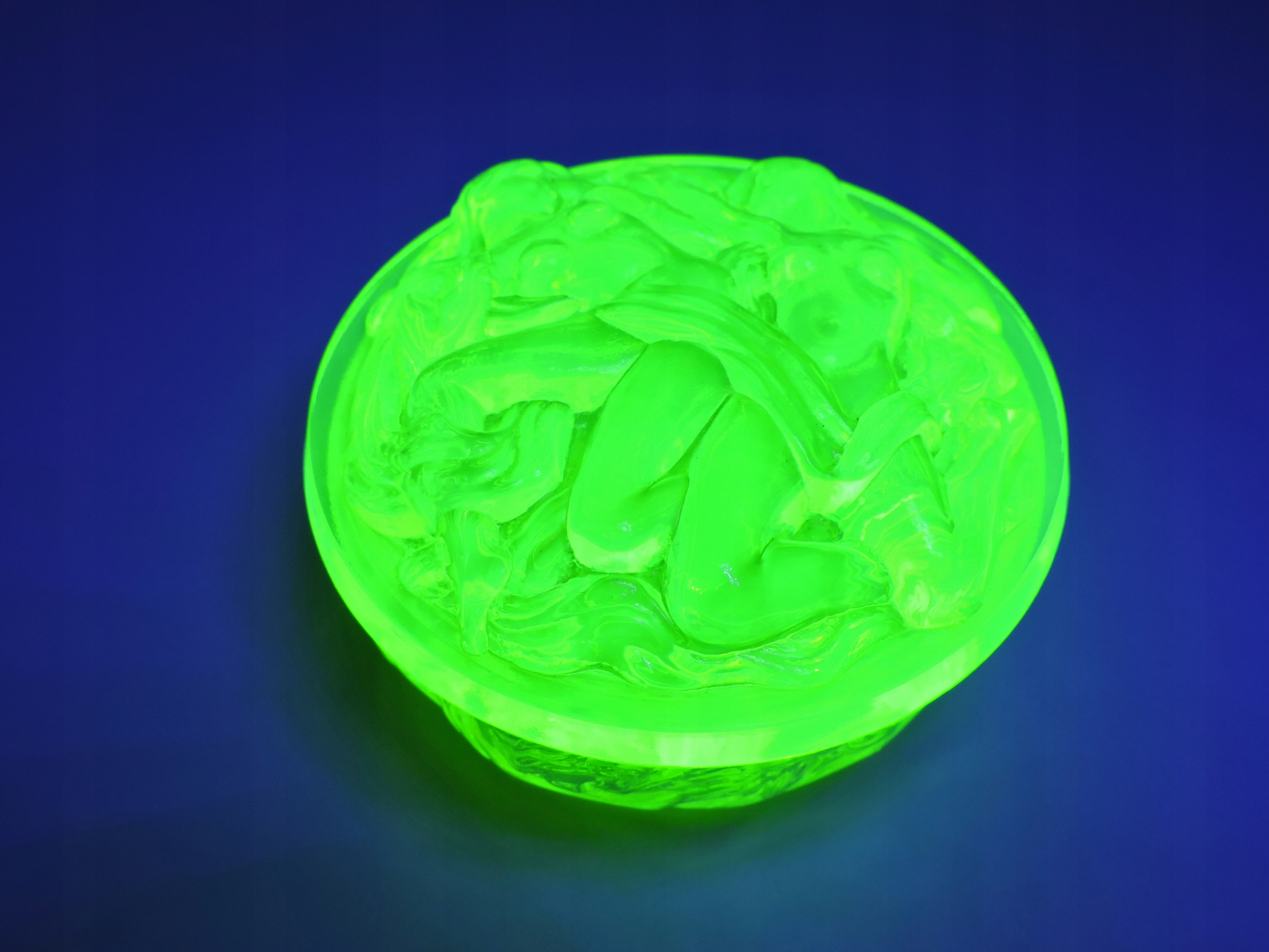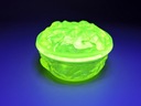 Unikalne szkło uranowe w odcieniu żółto-seledynowym, w promieniach ultrafioletowych świeci na zielono - jak na zdjęciach