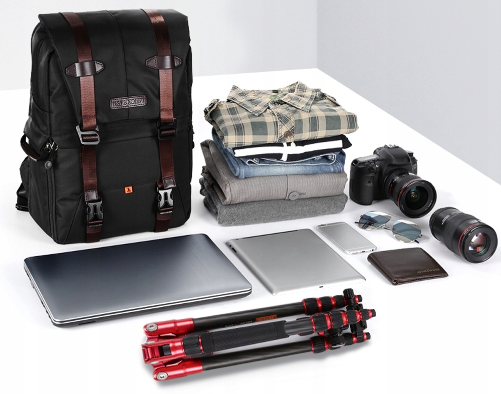Inne funkcjonalne części: paski do statywu, boczna saszetka na kubek i kilka toreb na zamek błyskawiczny na telefon, baterię, laptopa i tablet itp.