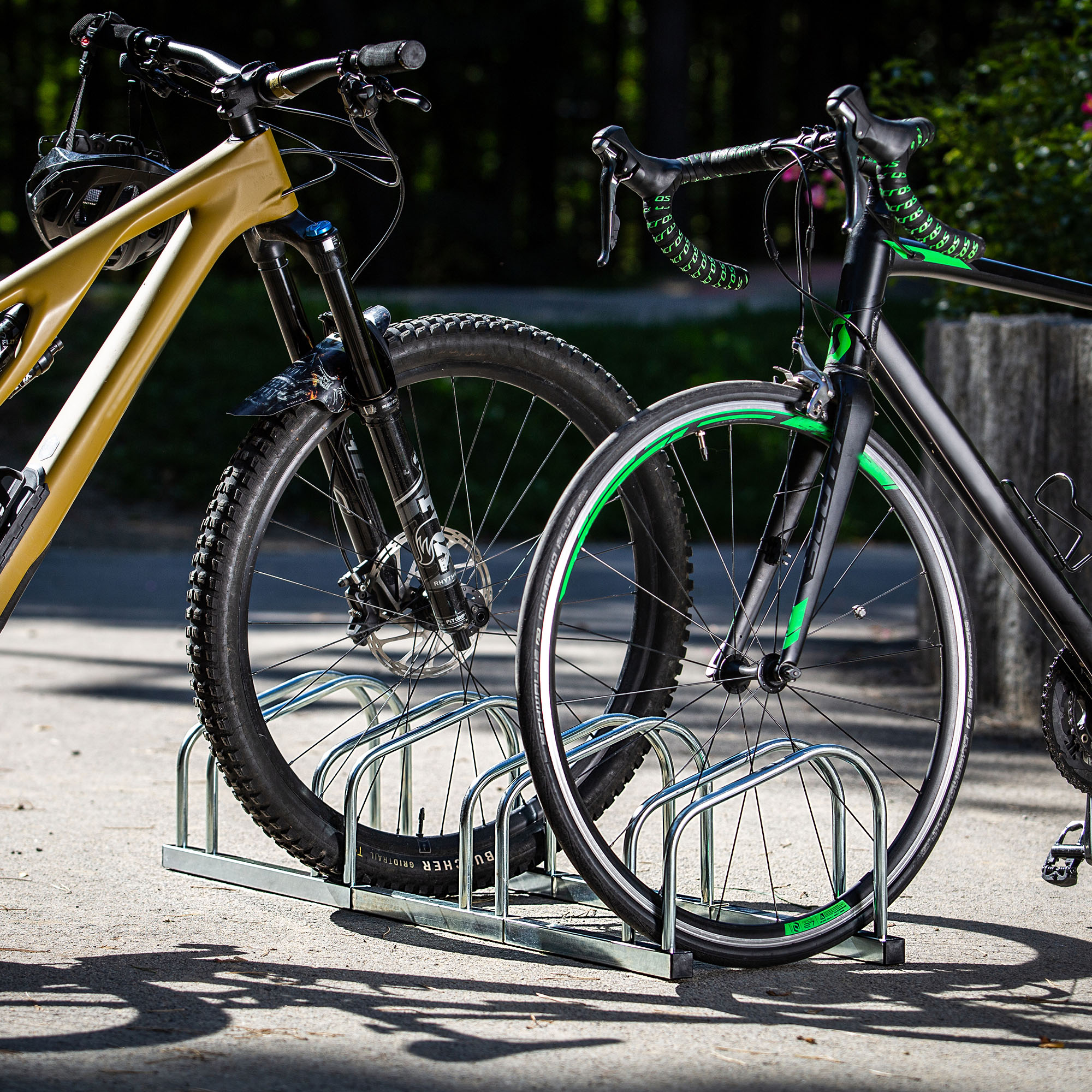 Stojak na rowery KADAX jest przystosowany do modeli z oponami o szerokości do 6,5 cm, dzięki czemu bez problemu zaparkujesz w nim rowery miejskie, górskie, trekkingowe, a nawet dziecięce.