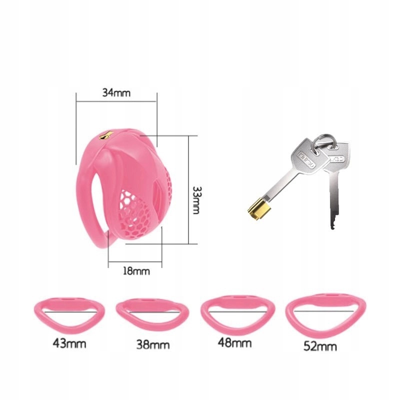 3. Regulowane dopasowanie Do zestawu dołączone są cztery pierścienie o średnicach 38, 43, 48 i 52 mm, które umożliwiają indywidualne dopasowanie klatki do anatomii użytkownika. Dzięki temu pas cnoty może być używany przez osoby o różnych preferencjach i budowie ciała.