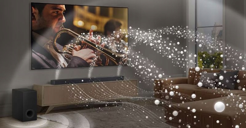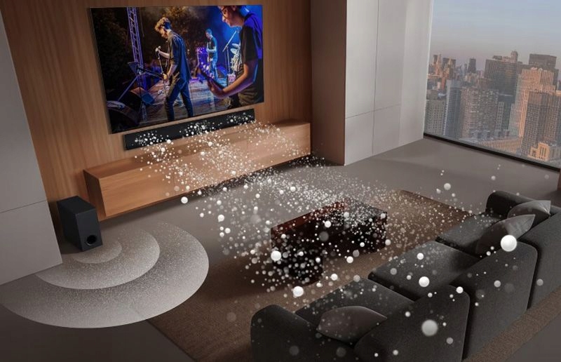 AI Room Calibration Pro W zgodzie z przestrzenią bez zniekształceń Soundbar skanuje pomieszczenie, lokalizując w nim Ciebie i tylne głośniki. Bez względu na położenie, dostosowuje różnice głośności i czas opóźnienia, oferując niezrównane wrażenia słuchowe, płynące z tyłu pomieszczenia.