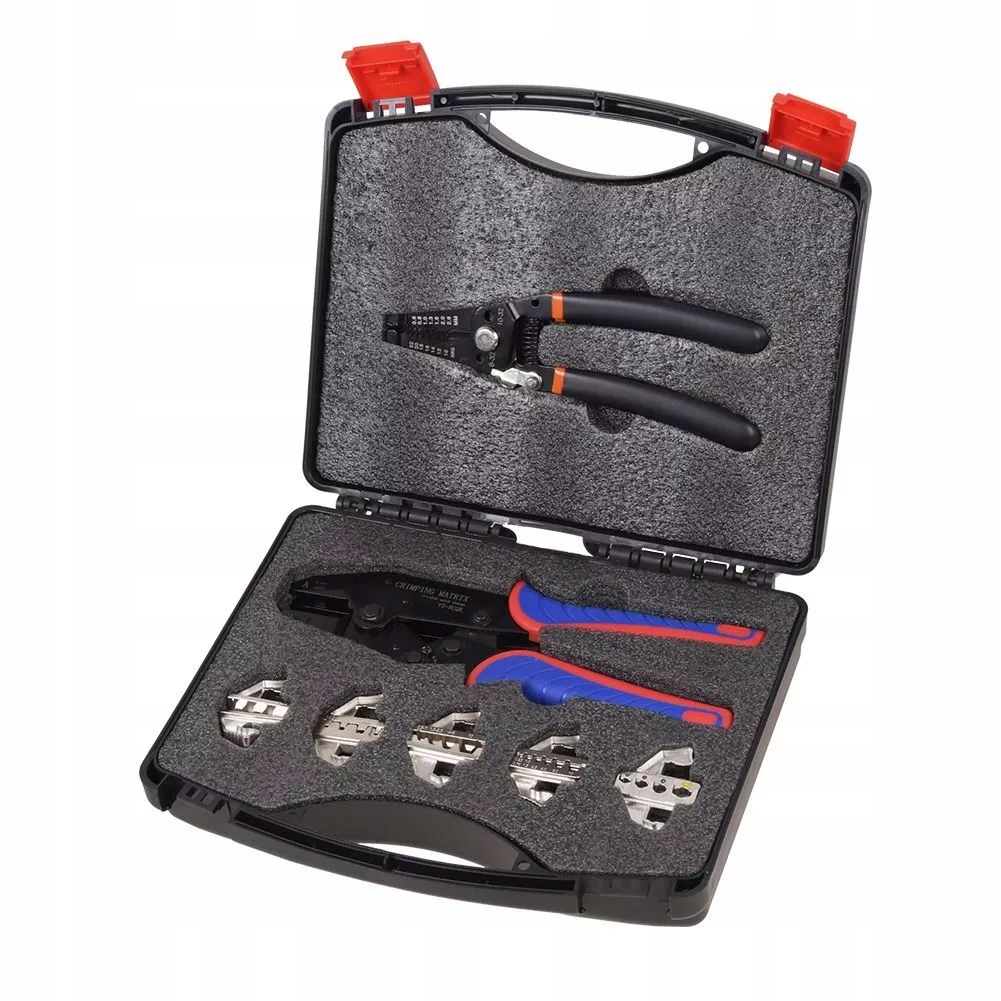 Zestaw narzędzi do zaciskania złączy typu „wszystko w jednym” zawiera kompaktowe narzędzie do zaciskania, 5 szybko wymiennych matryc, ściągacz izolacji i pudełko do przechowywania.