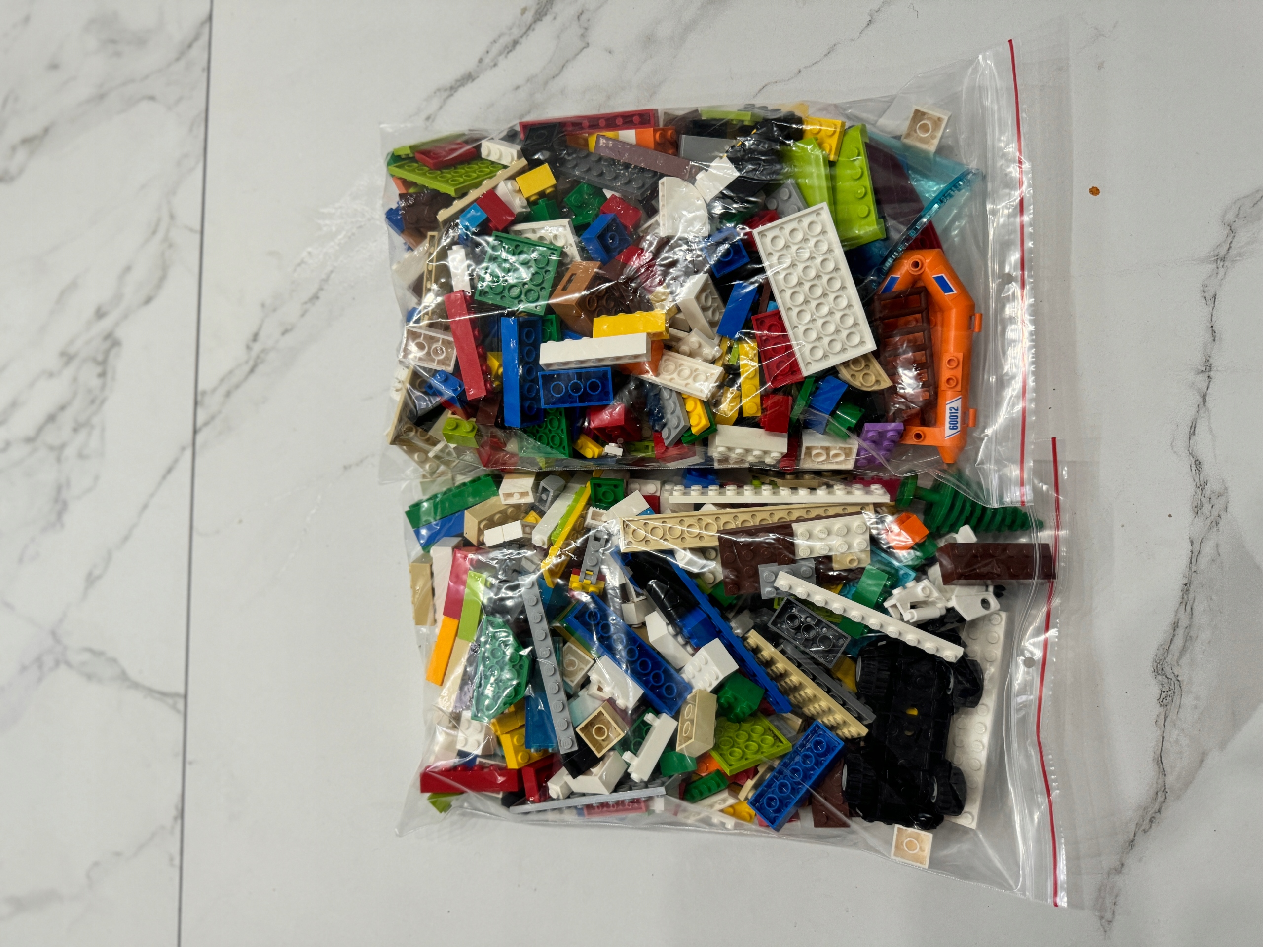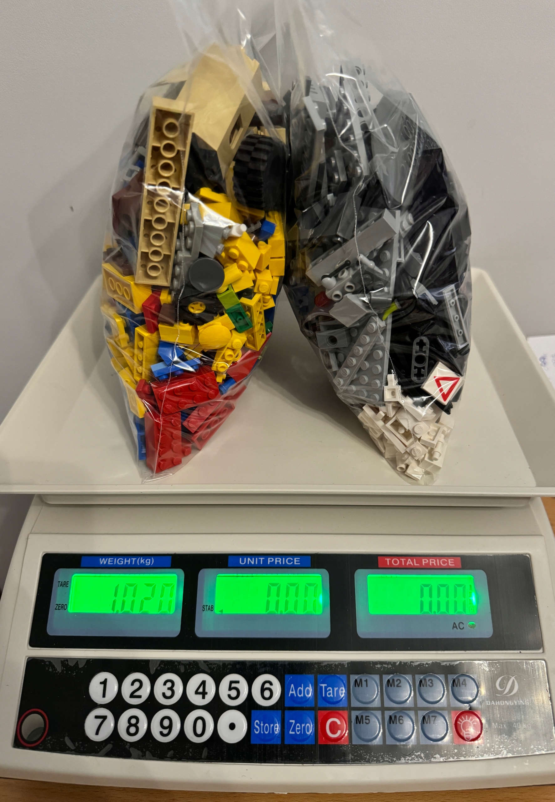 Zdjęcia przedstawiają worki w których znajduję się losowo zapakowany kilogram klocków Lego.