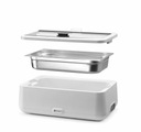 Stylowy i funkcjonalny design stworzony przez holenderskiego projektanta Roberta Bronwassera. Obudowa wykonana z polipropylenu odpornego na wysoką temperaturę. Demontowany wkład GN 1/1 o wysokości (H)100mm, wykonany ze stali nierdzewnej AISI 304, łatwy w czyszczeniu. Grzałka wykonana ze stali nierdzewnej AISI 304, umieszczona we wkładzie na wodę dla wydajnego transferu ciepła. Pokrywa ze szkła hartowanego wyposażona w izolowany uchwyt oraz aluminiowy zawias. Na pokrywie umieszczony uchwyt (holder) na etykietę z nazwą dania.