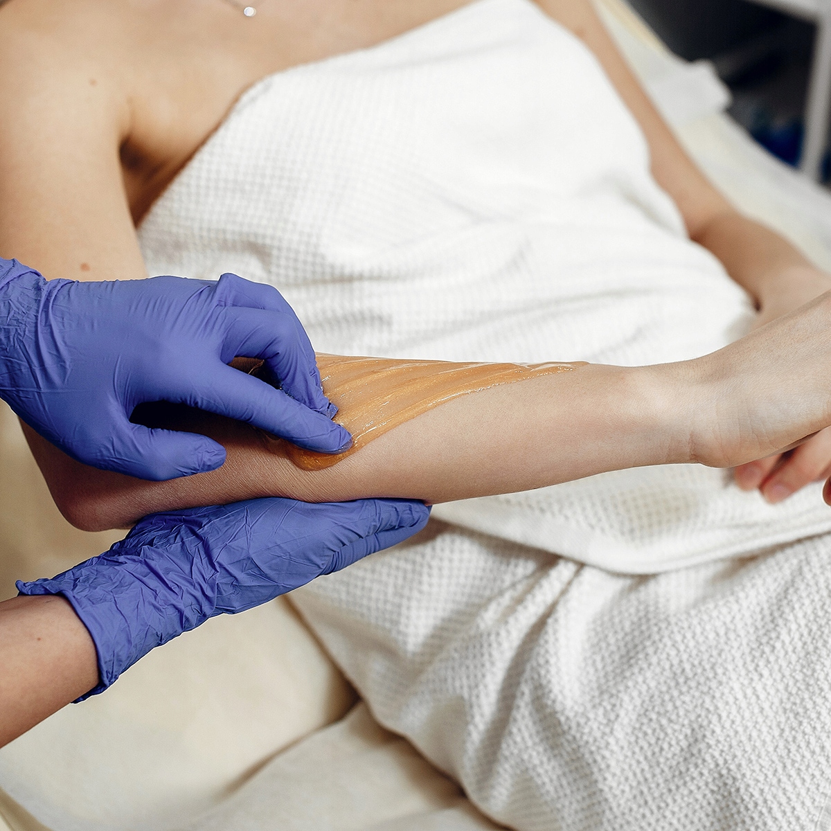 ▶️ Opcja 5: Lepką warstwę pozostałą po zabiegu pastą cukrową zmyj wilgotną serwetą lub pod bieżącą wodą. Zabieg możemy powtórzyć, dopiero gdy skóra jest całkowicie sucha.