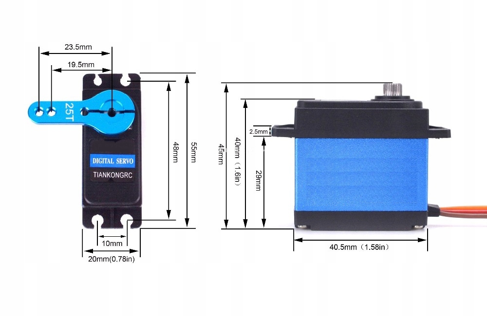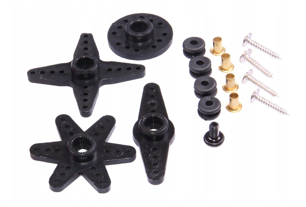 Serwo posiada metalowe zębatki i jest łożyskowane o wysokiej wytrzymałości.W komplecie orczyki oraz zestaw śrubek i tulejek.