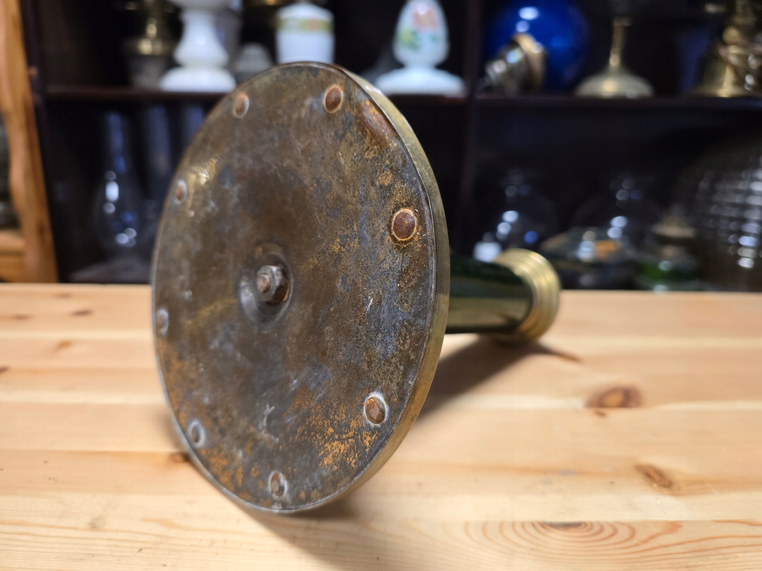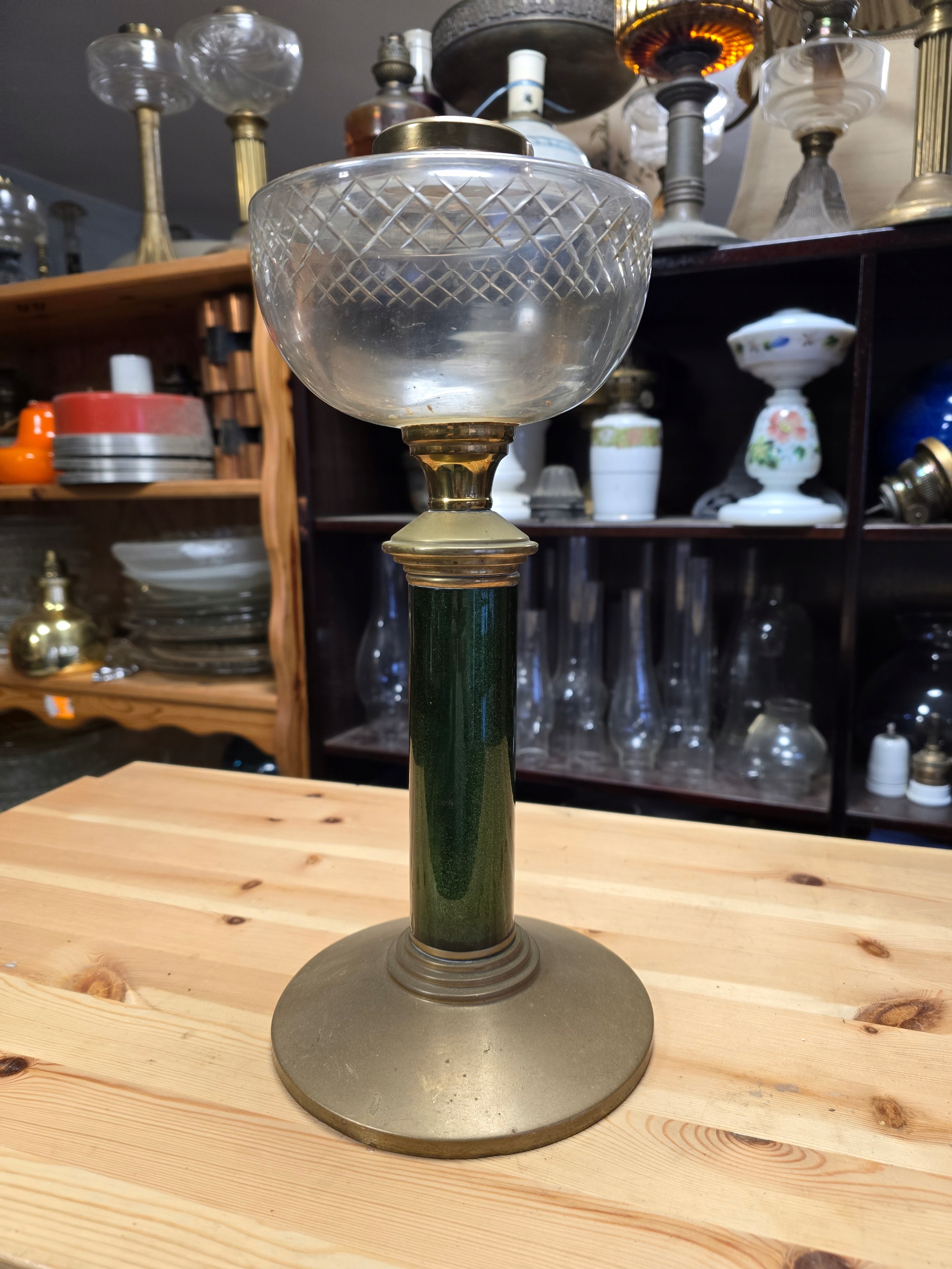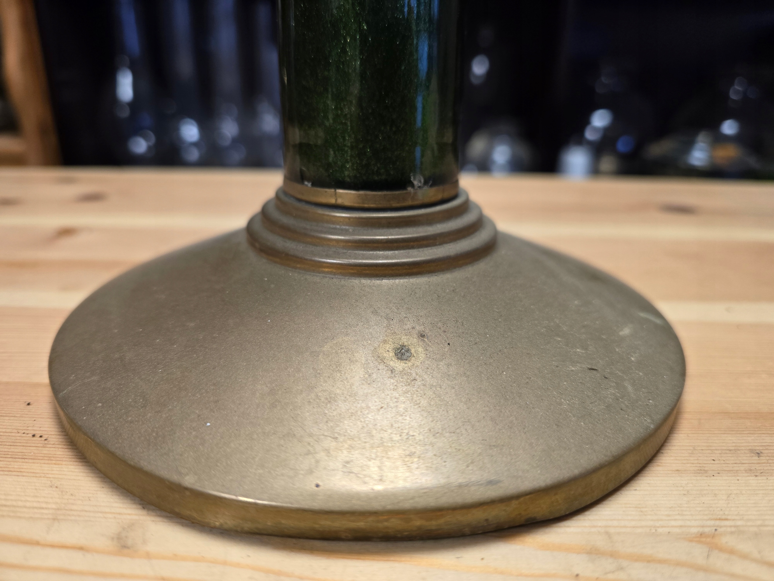 Stara podstawa lampy naftowej do renowacji wizualnej , wymiary 16 x wys. 21. UWAGA SZKLANY ZBIORBIK NIE JEST PRZEDMIOTEM OFERTY ZOSTAŁ TYLKO WKRĘCONY POGLĄDOWO DO PODSTAWY.