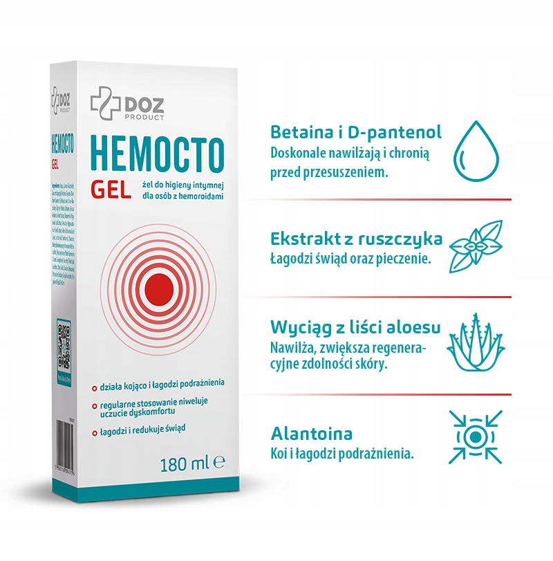 DOZ Product Hemocto Gel (180 ml) to specjalistyczny żel do higieny intymnej stworzony z myślą o osobach zmagających się z hemoroidami i podrażnieniami w okolicach intymnych. Łagodna formuła skutecznie oczyszcza, a jednocześnie działa kojąco i nawilżająco, przynosząc ulgę w dyskomforcie. Regularne stosowanie wspiera naturalną barierę ochronną skóry, redukuje uczucie pieczenia i swędzenia oraz wspomaga codzienną pielęgnację okolic intymnych.