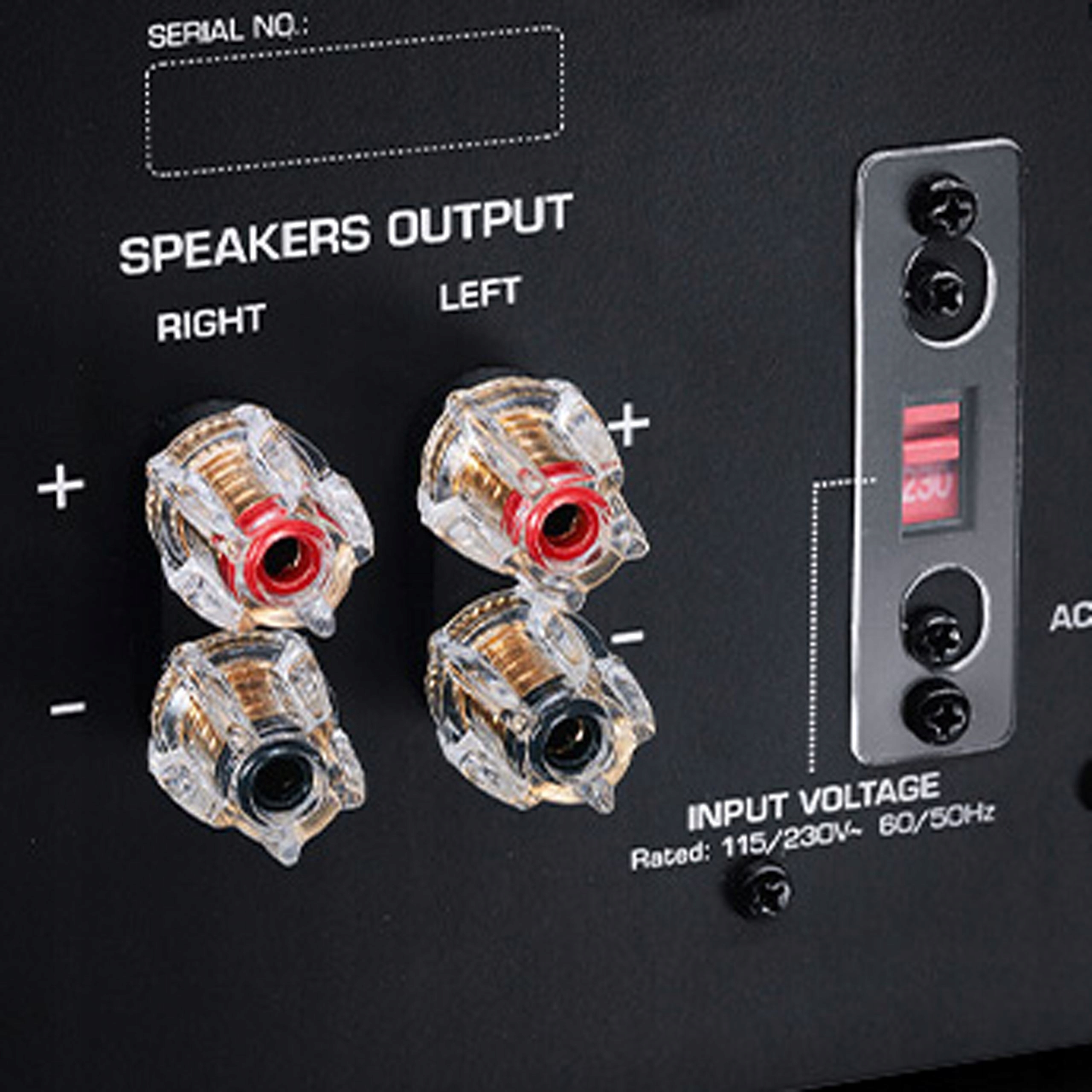 Potężny tranzystorowy stopień wyjściowy wytwarza 200W mocy RMS na kanał przy 4 Ohm.