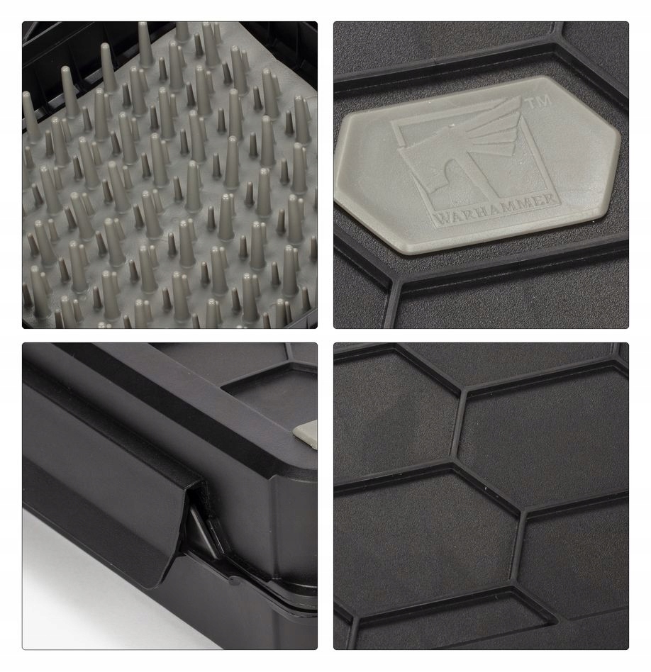 Obudowa jest wyłożona gładkimi silikonowymi włoskami, które zamykają się razem z pokrywką i pewnie trzymają miniatury na miejscu, chroniąc je przed uszkodzeniem. Dwie połówki pozwalają na użycie jednej strony jako tacy do umieszczania modeli przed zamknięciem obudowy drugą, za pomocą klipsów umieszczonych wokół krawędzi, a każda połówka obudowy ma gumową górę, aby zapobiec jej upadkowi lub zsunięciu się ze stołu.