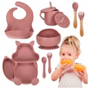 Każdy element zestawu został wykonany z trwałego silikonu bez BPA, który jest bezpieczny i przyjemny w dotyku. Wszystkie naczynia mają zaokrąglone krawędzie, co sprawia, że są dostosowane do małych rączek dziecka. Śliniak z szeroką kieszonką skutecznie zbiera resztki jedzenia, a kubek może pełnić funkcję zarówno bidonu, jak i pojemnika na przekąski.