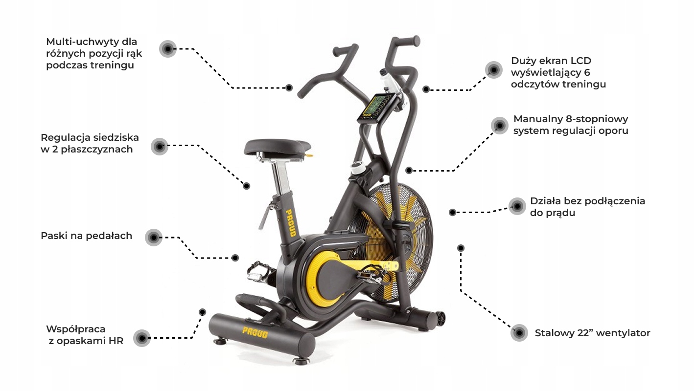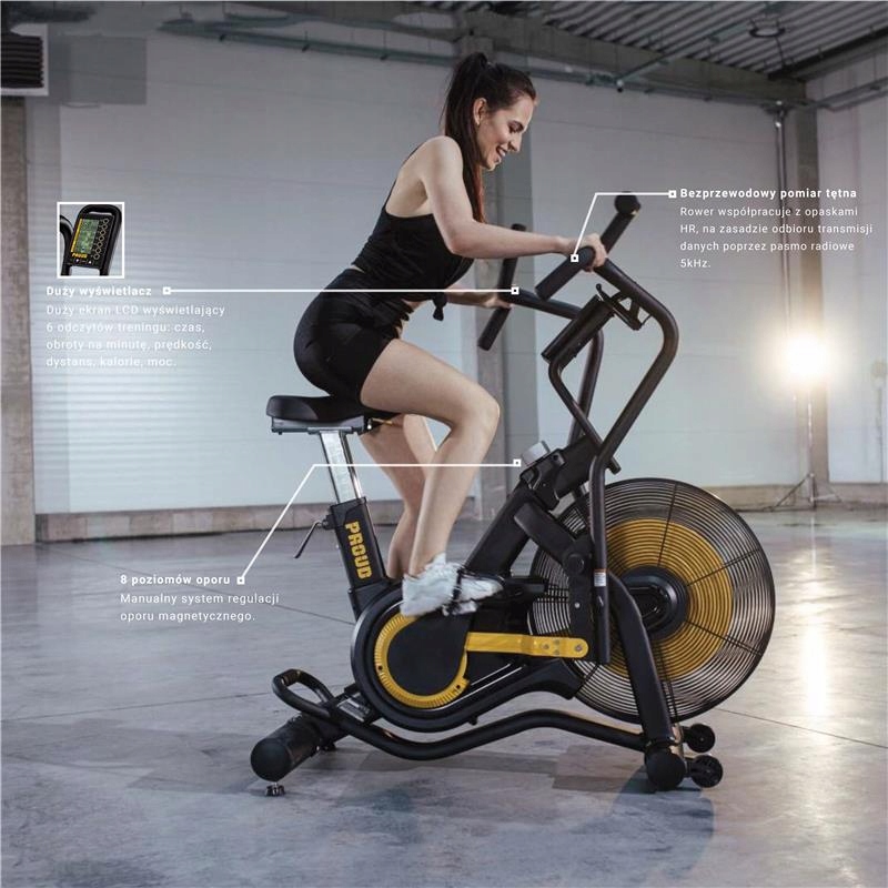 Rowery powietrzne marki PROUD projektowane są z myślą o użytku komercyjnym, dlatego powstają z bardzo wytrzymałych materiałów. Różnica w wadze sprzętu w porównaniu do innych air bike'ów dostępnych na rynku wynika z jakości zastosowanych komponentów. Dodatkowo dokładne spasowanie elementów sprawia, że pracują bardzo płynnie i cicho. luzów między elementami, co znacznie poprawia komfort treningu.