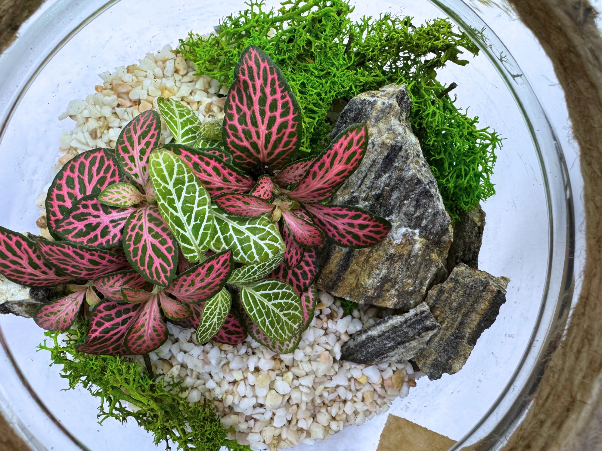 Fitonia to niskorosnąca roślina o dekoracyjnych liściach z wyraźnym żyłkowaniem, która świetnie czuje się w warunkach wysokiej wilgotności – czyli idealnych dla zamkniętych ekosystemów. Jej kompaktowy wzrost sprawia, że doskonale wpasowuje się w przestrzeń słoja, dodając mu koloru i życia.