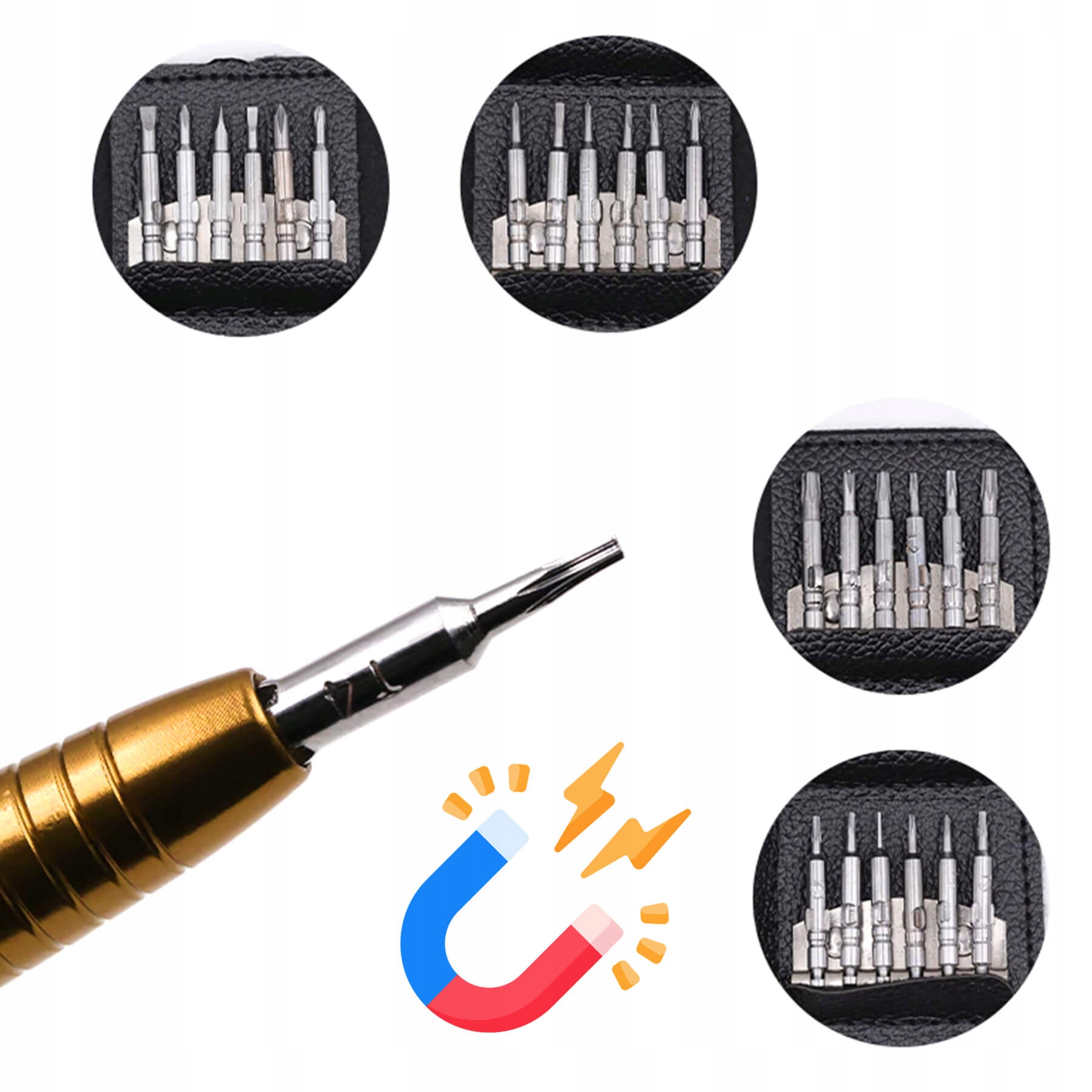 ✔️ 24 różne końcówki + rączka – zestaw zawiera wkrętaki krzyżakowe, płaskie, torx, pięciogwiazdkowe, Y, trójkątne i punktowe, zapewniając uniwersalne narzędzie do każdej naprawy.