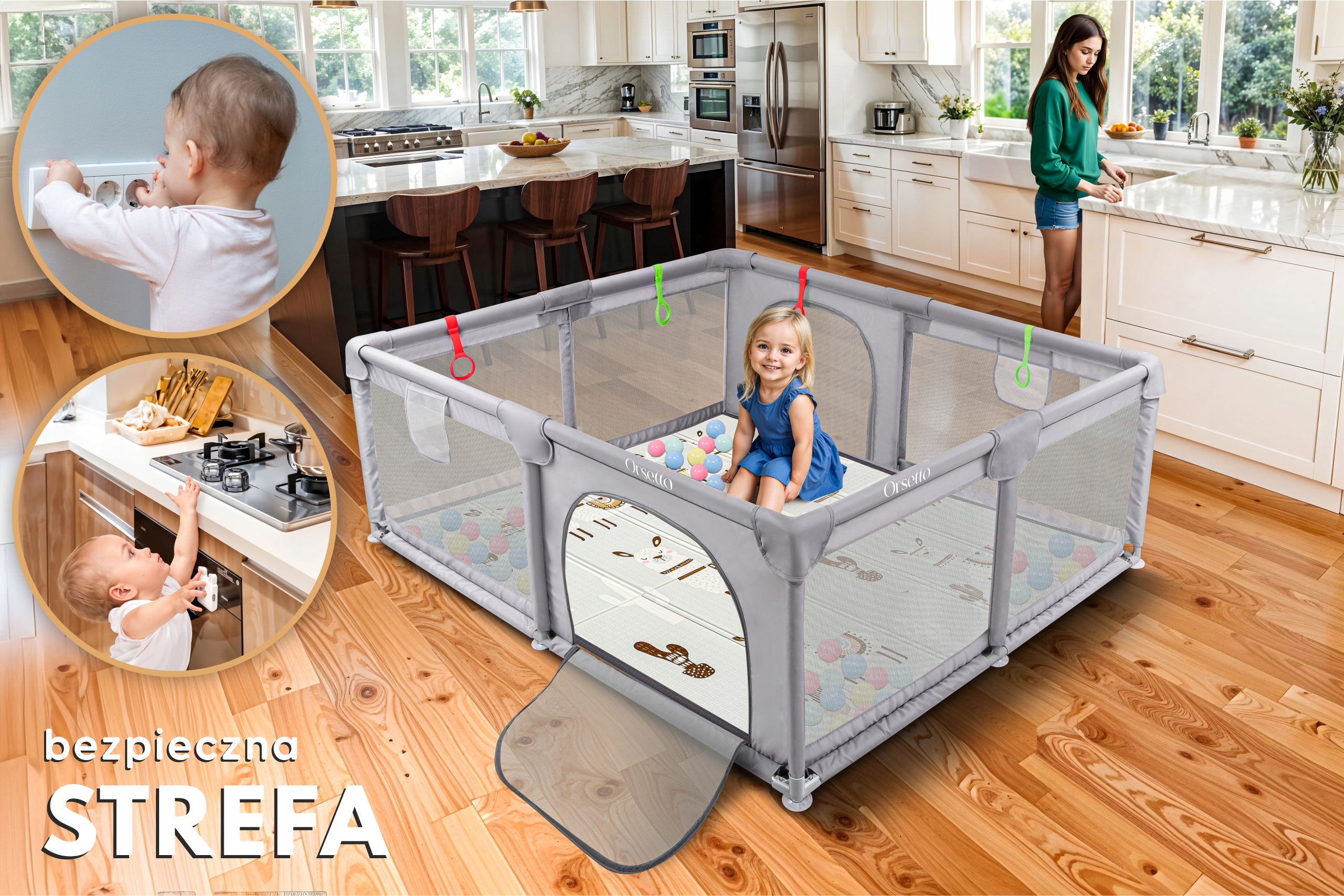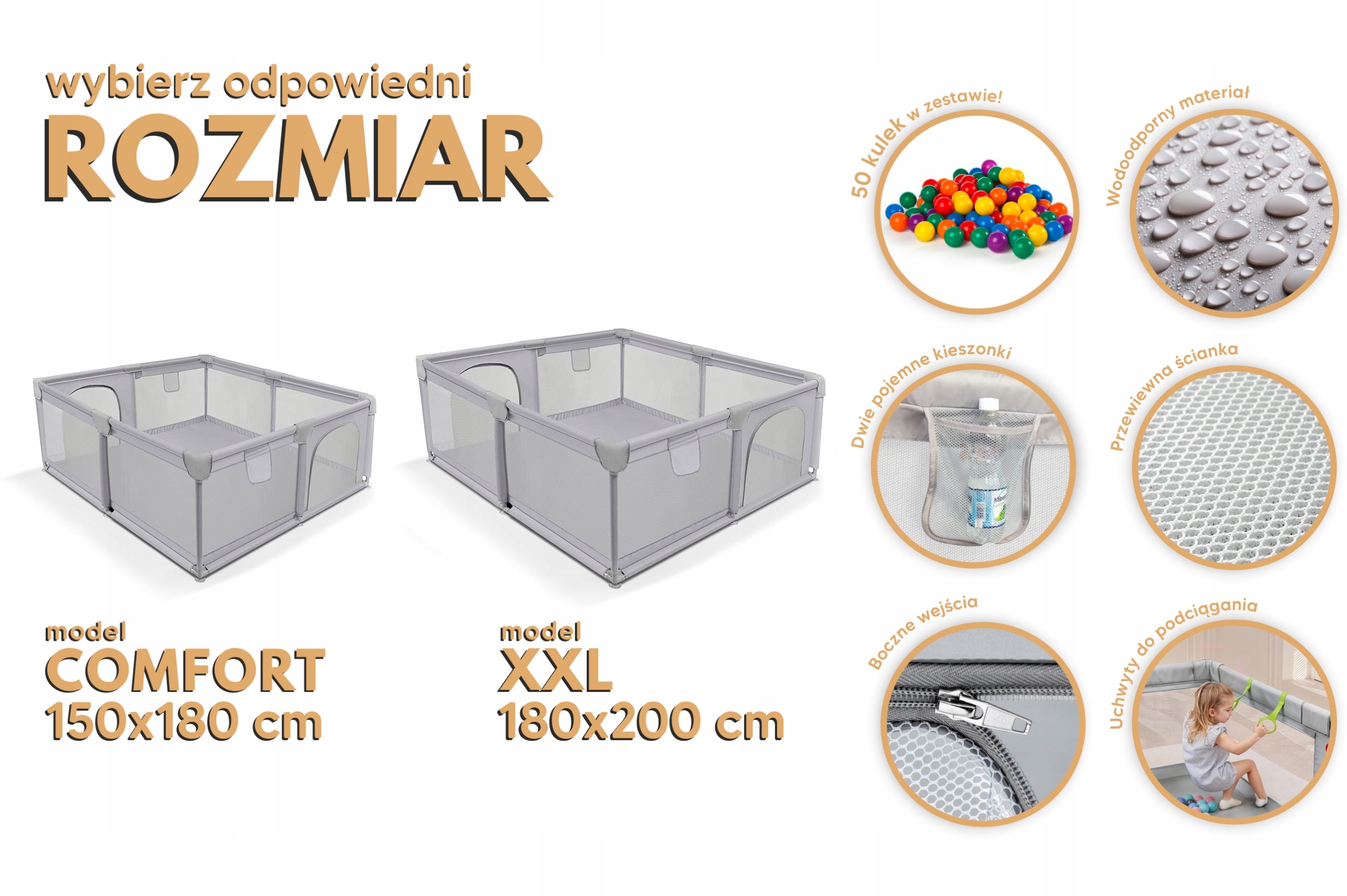 Kojec dziecięcy duży 150x180 cm z edukacyjną matą piankową, czterema uchwytami dla dzieci i 50 kolorowymi piłeczkami do zabawy! Przeznaczony dla dzieci od pierwszych dni życia.