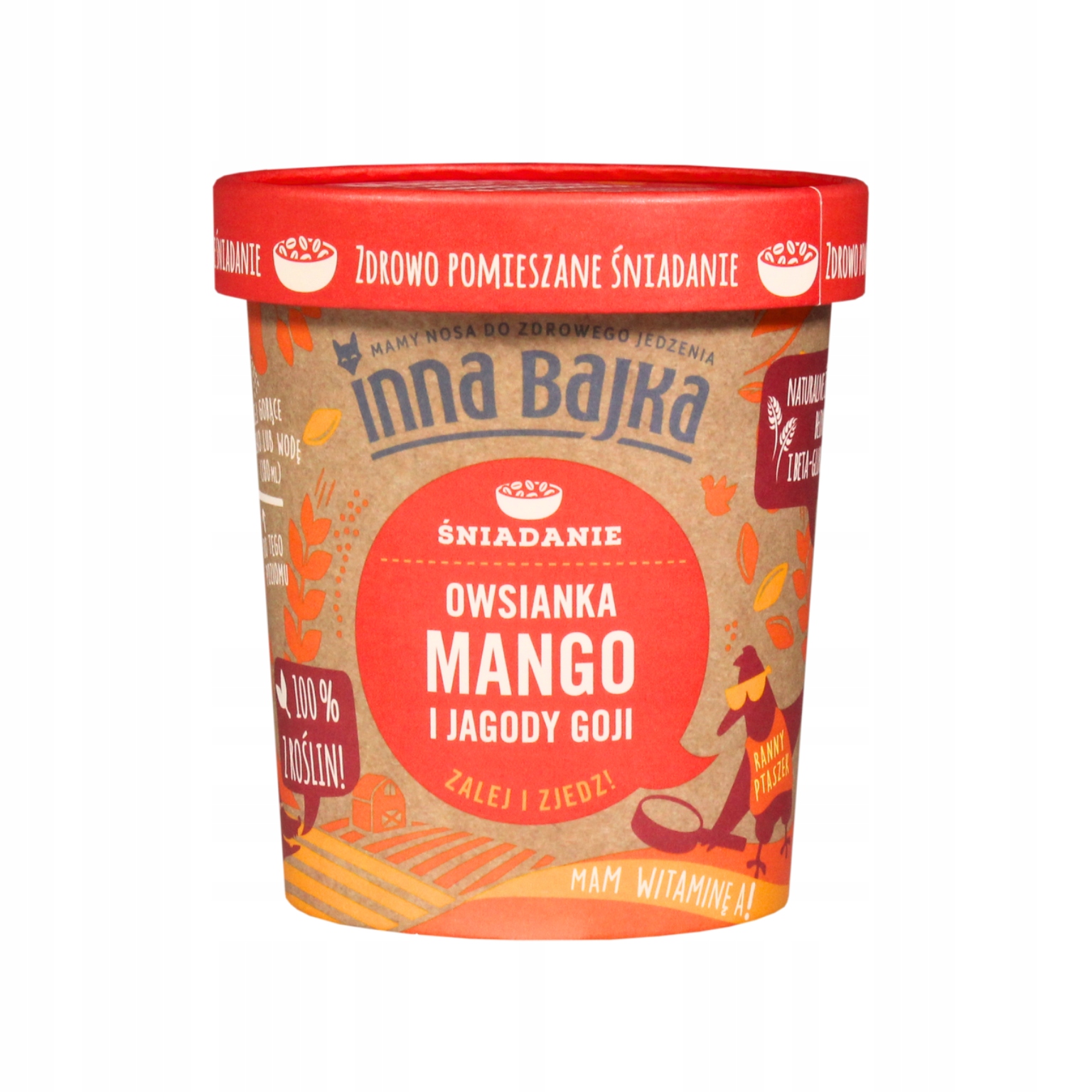 Składniki: płatki owsiane 61%, mango suszone 15%, jagody goi 12%, nasiona chia, cukier kokosowy, kurkuma