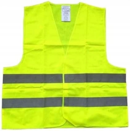Kamizelka ostrzegawcza wykonana z wysokiej jakości poliestrowej dzianiny w kolorze żółtym fluorescencyjnym z dwoma pasami odblaskowymi, zapinana z przodu na rzep.