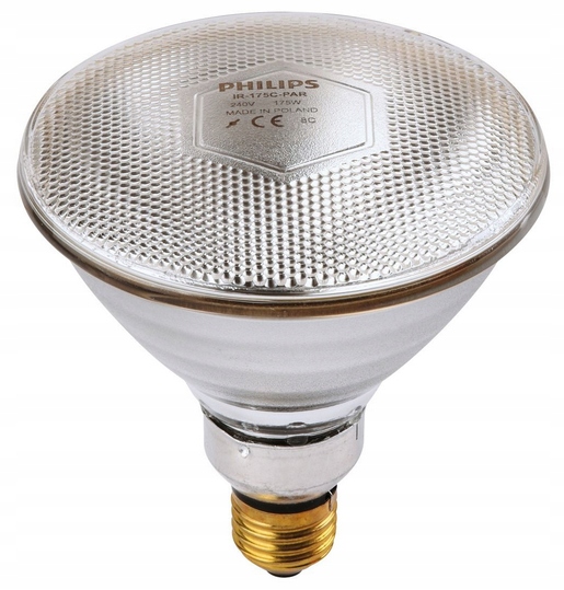 Energooszczędna żarówka do oprawy napromiennikowej firmy Philips o mocy 175 W, przeznaczona jest do ogrzewania zarówno młodych prosiąt, piskląt czy szczeniąt, jak i starszych osobników.