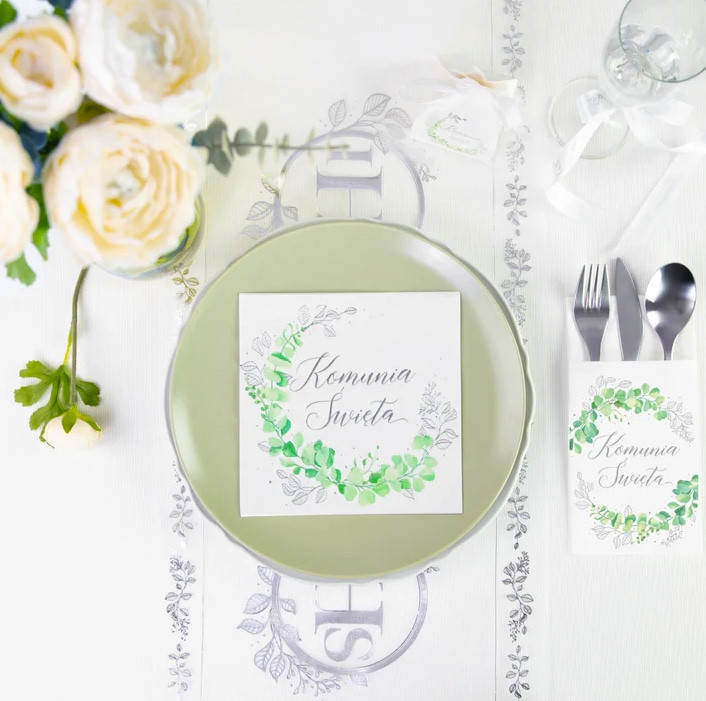 Serwetki papierowe z tradycyjnym, srebrnym napisem Komunia Święta na białym tle. Subtelny napis otoczony jest wieńcem delikatnych listków eukaliptusa, co sprawia, że serwetki są eleganckie i oryginalne.
