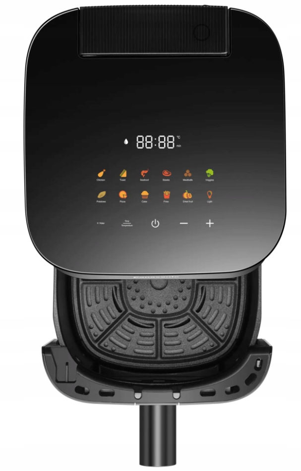 Zapomnij o zgadywaniu. Po prostu wybierz jedno z 11 wstępnie ustawionych menu, dotykając kolorowych, łatwych w obsłudze ikon na panelu LED: Frytki, kurczak, tosty, owoce morza, steki, klopsiki, warzywa, ziemniaki, pizza, ciasto i suszone owoce. Jeśli chcesz, możesz dostosować działanie, ustawiając własną temperaturę i czas – od 1 do 60 minut i od 80°C do 200°C.