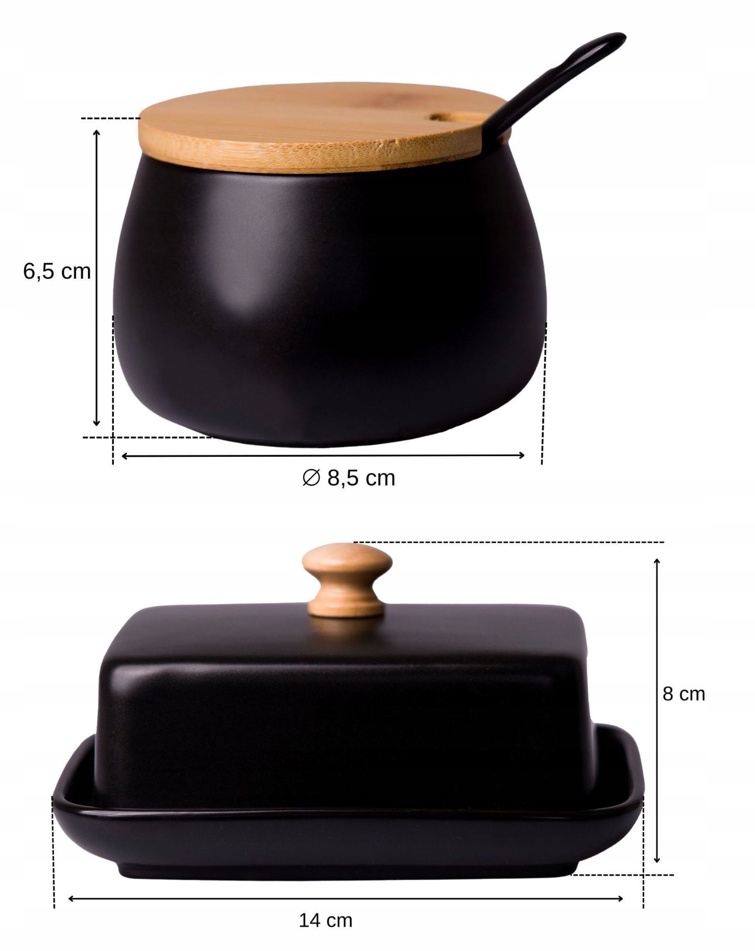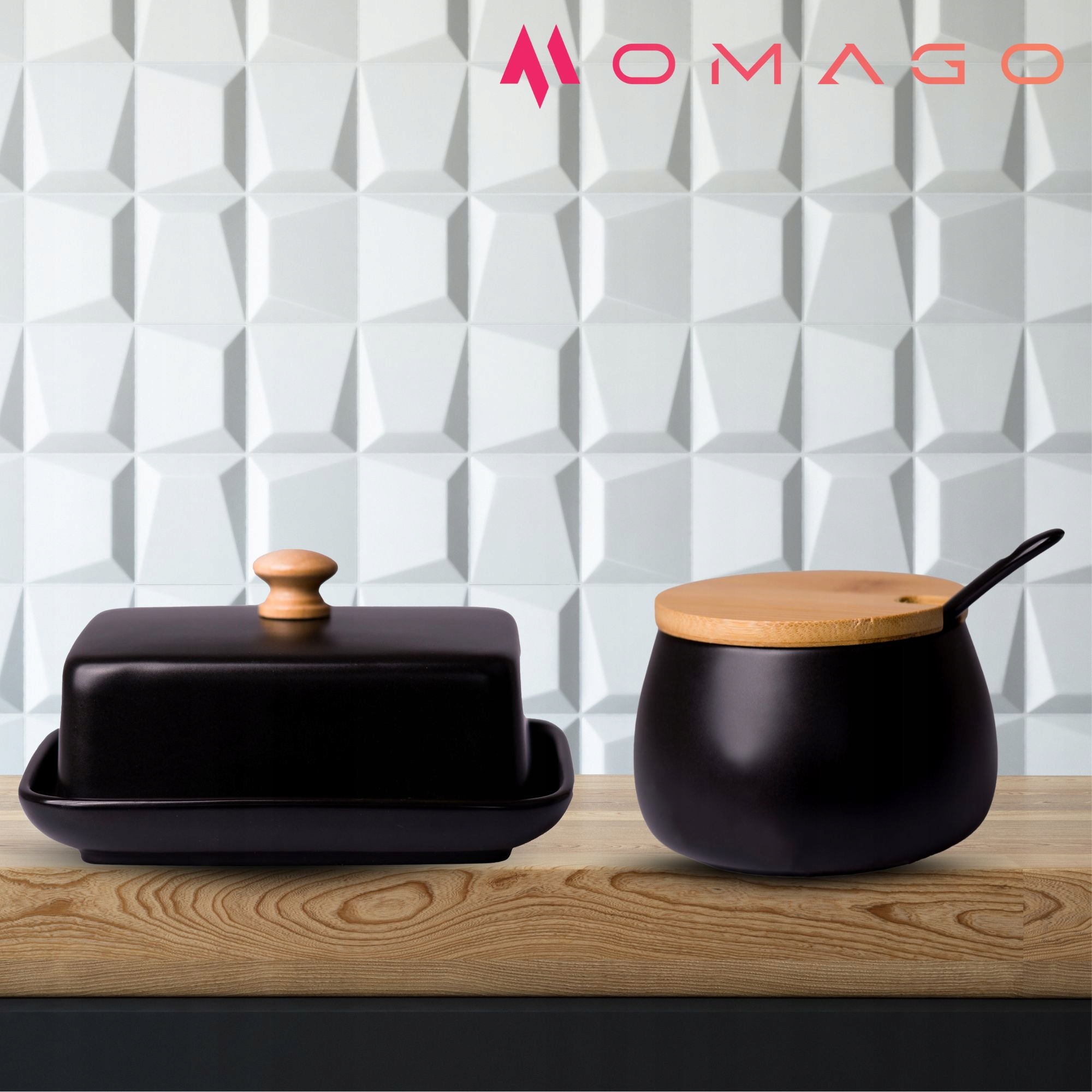 Zestaw maselnicy i cukiernicy OMAGO to doskonała para, która idealnie wpasuje się w każdy stół, wprowadzając elegancję i funkcjonalność. Oba naczynia wykonane z wysokiej jakości ceramiki w klasycznej czerni z bambusowymi pokrywkami stanowią wyjątkowy element dekoracyjny i praktyczny w kuchni. Dzięki temu zestawowi Twoje śniadanie lub herbata zyskają nowy, stylowy charakter.