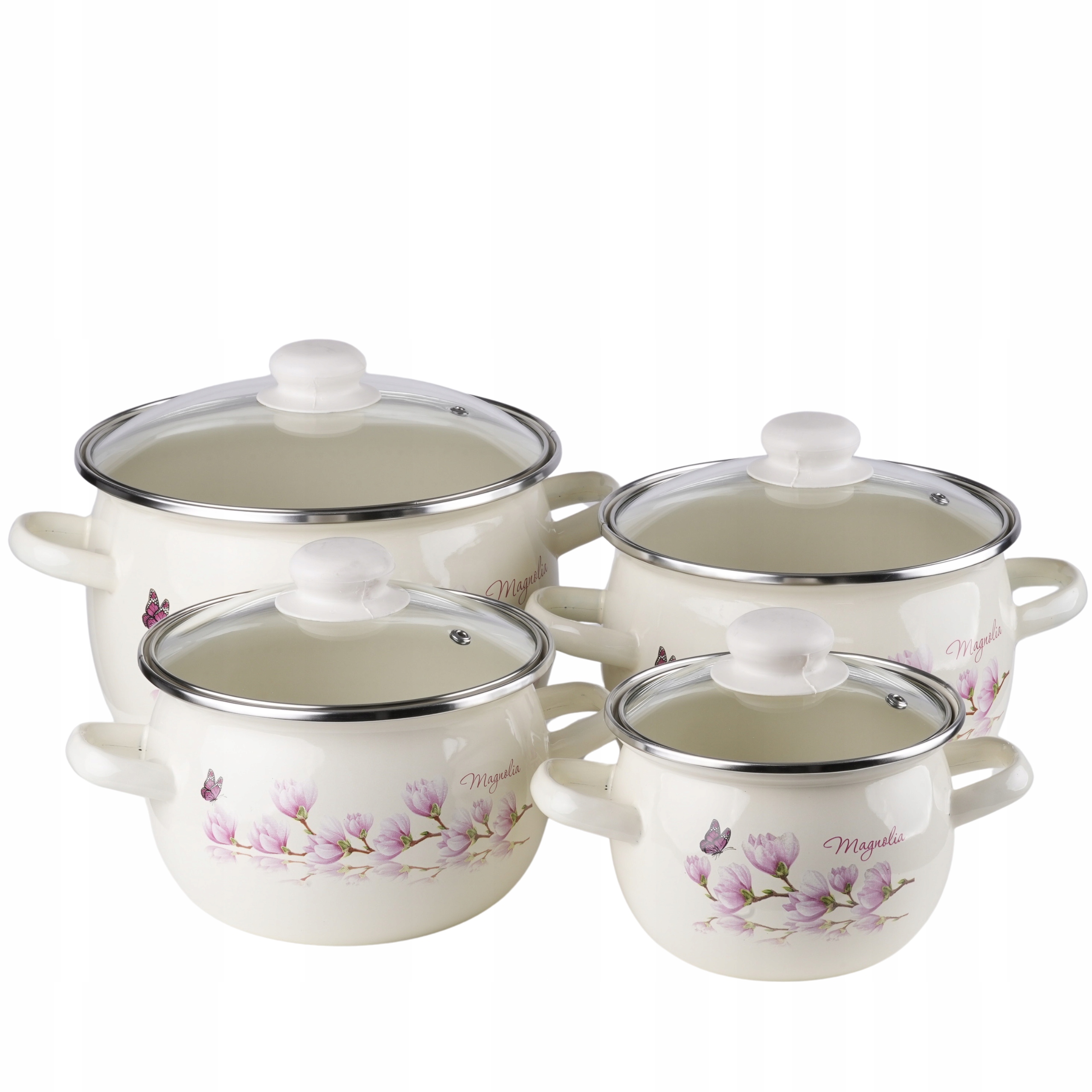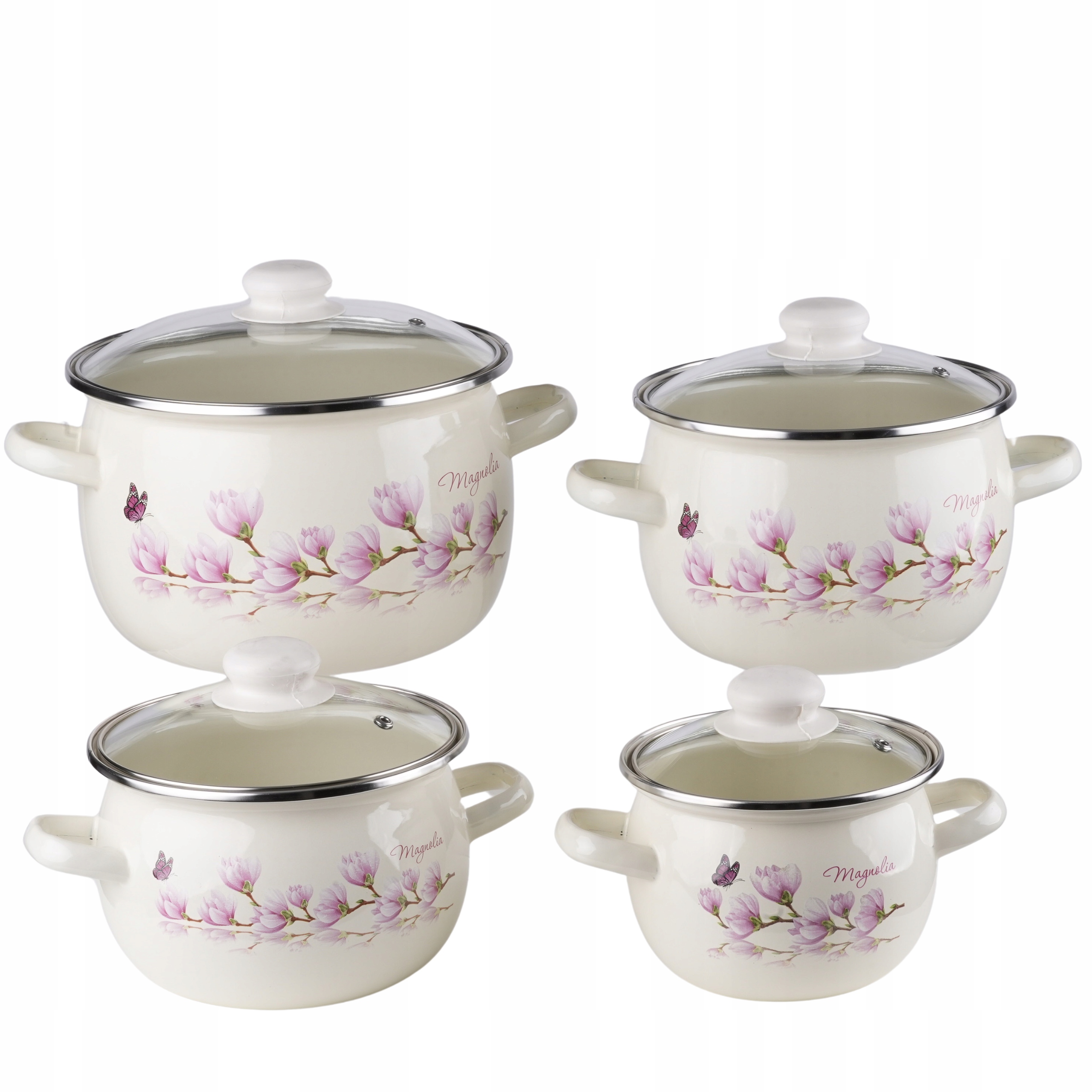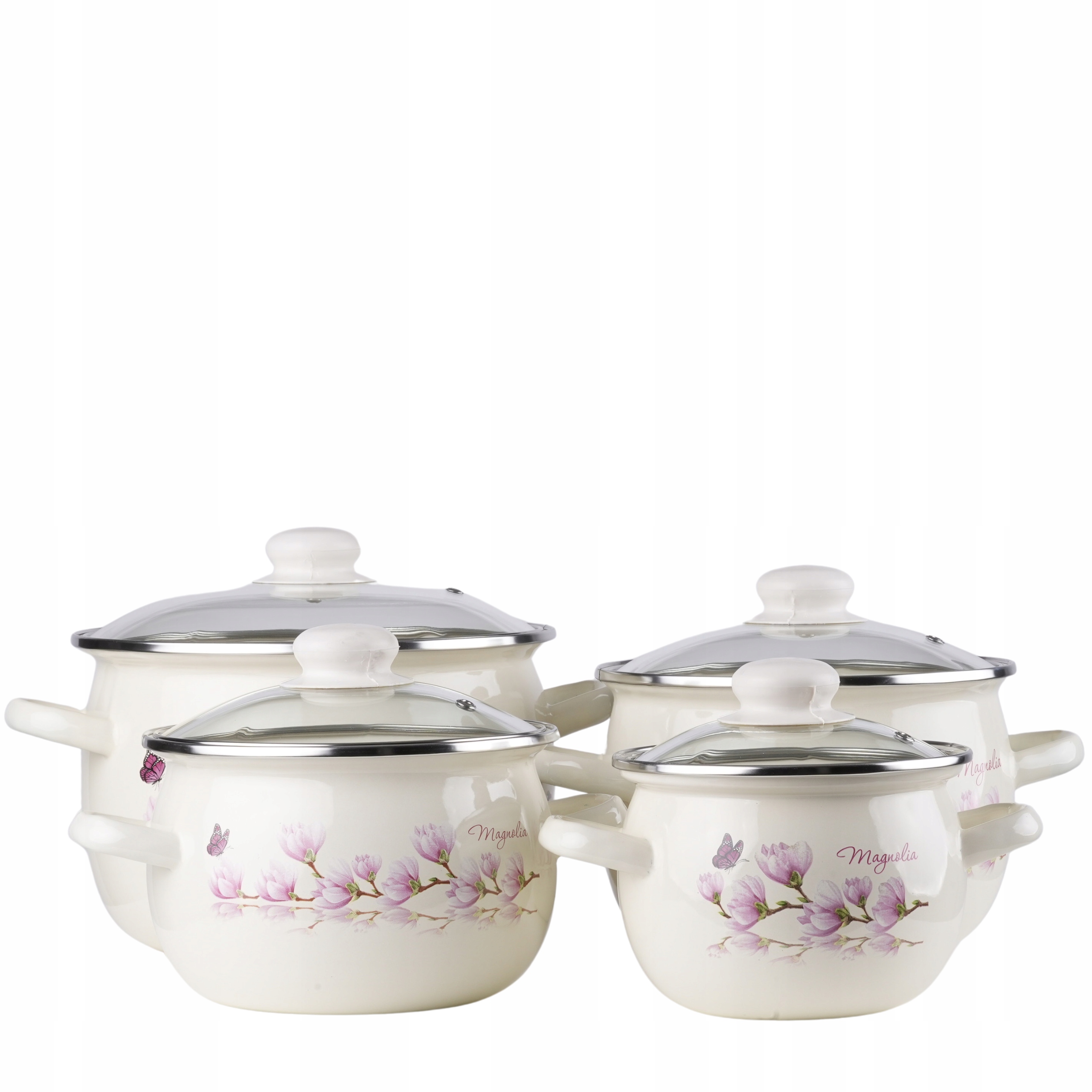 ✅ komplet garnków MAGNOLIA to połączenie baryłkowatego kształtu z uwielbianą przez wielu emalią. W jego skład wchodzą 4 garnki o różnych pojemnościach, każdy z dopasowaną do niego szklaną pokrywą