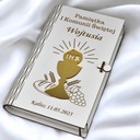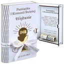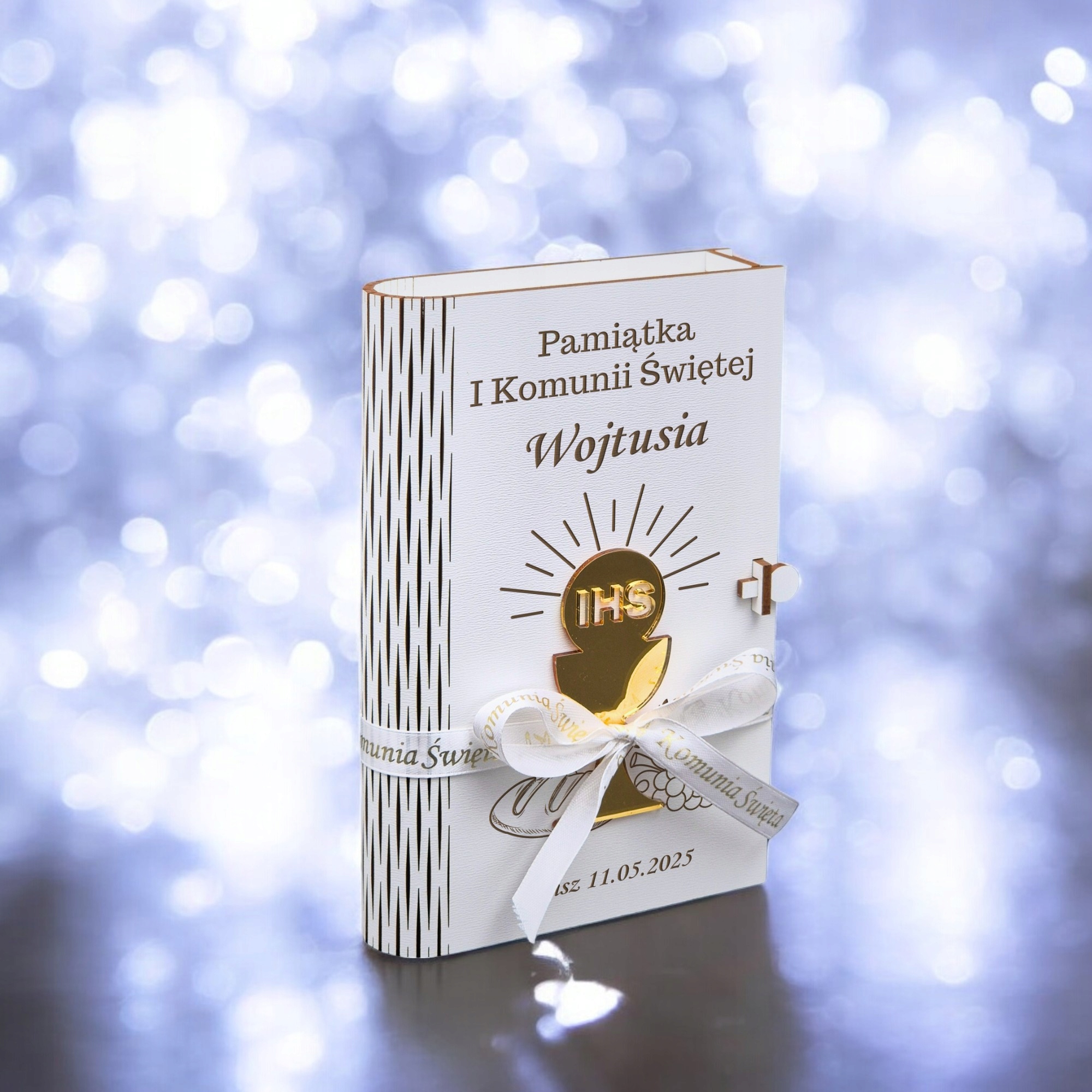 ✅ Zawartość zestawu: personalizowane pudełko, tabliczka z życzeniami, uchwyt na pieniądze, wstążka z napisem „Komunia Święta”