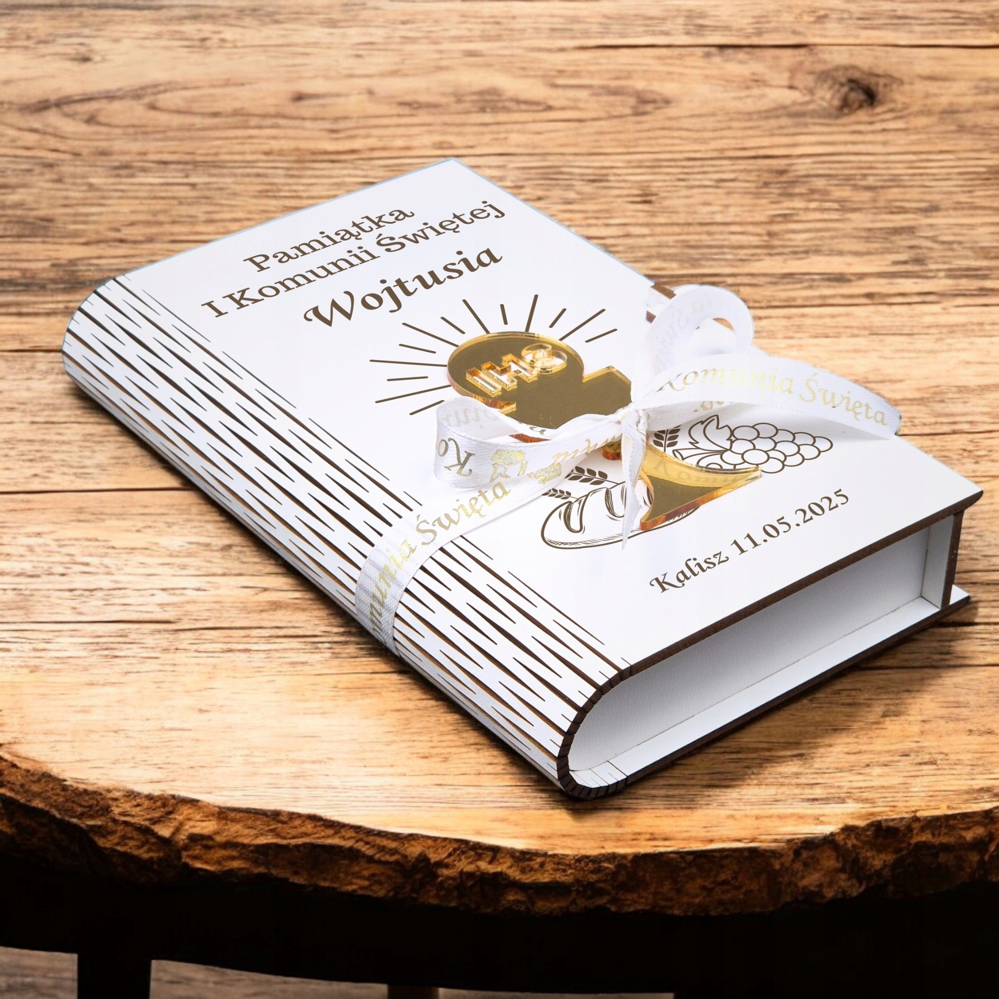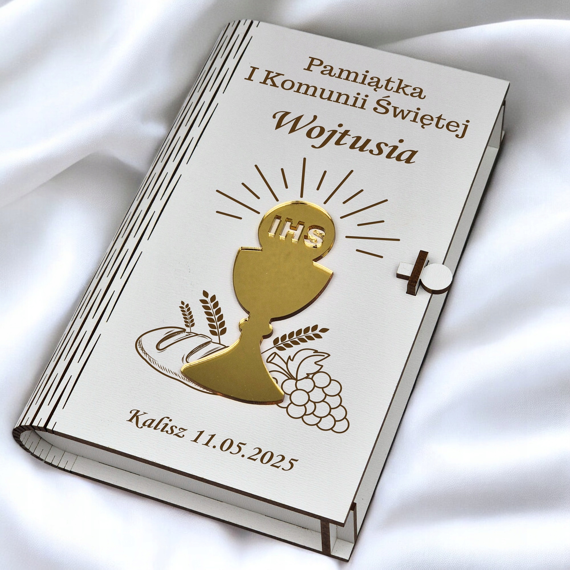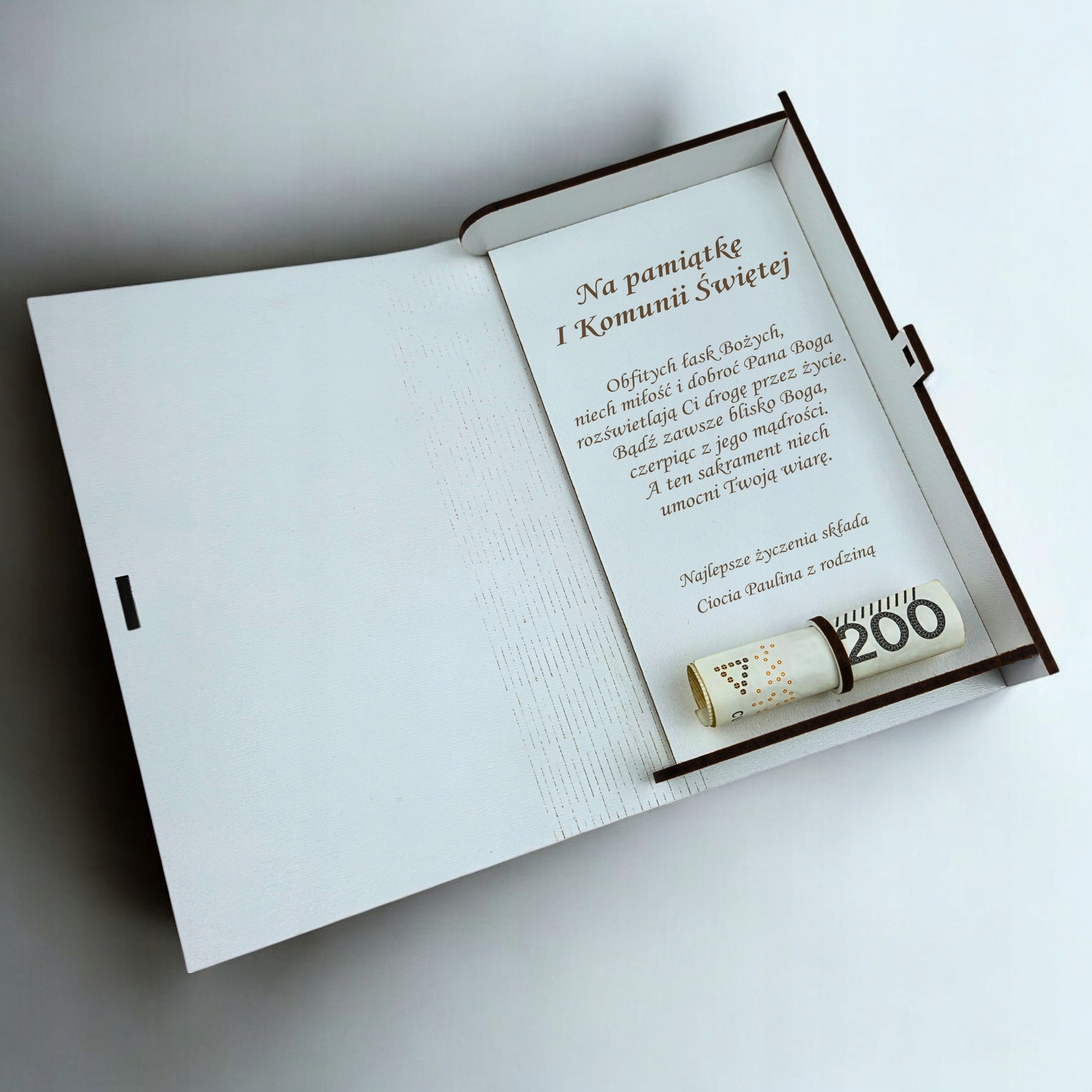 Szukasz wyjątkowego upominku na Pierwszą Komunię Świętą? Nasze eleganckie pudełko na pieniądze to doskonała pamiątka tego ważnego dnia. Wykonane z najwyższą starannością, ozdobione precyzyjnym grawerem oraz trójwymiarowymi dekoracjami, zachwyci każdego obdarowanego.