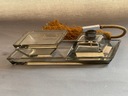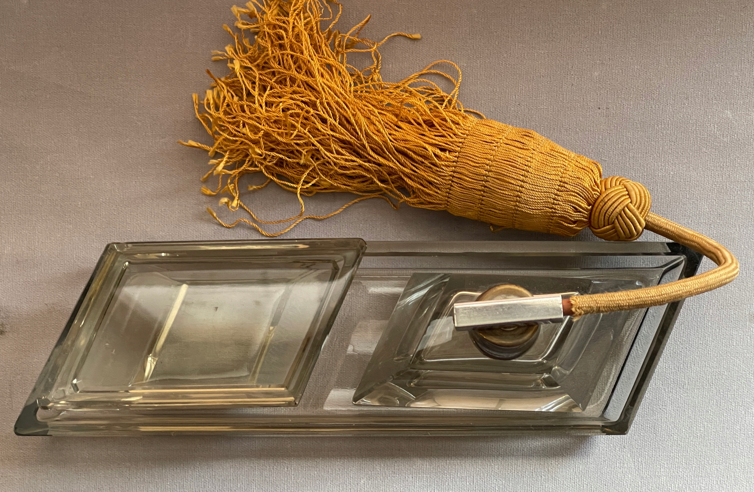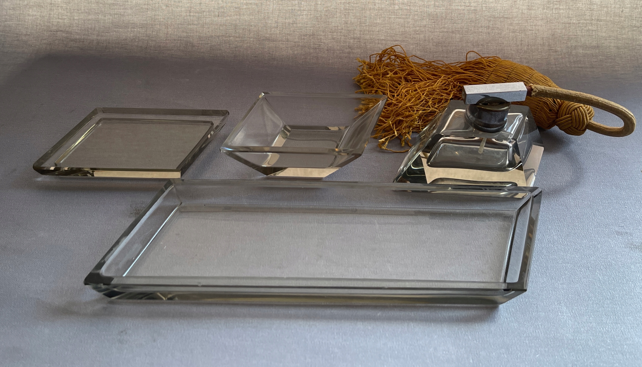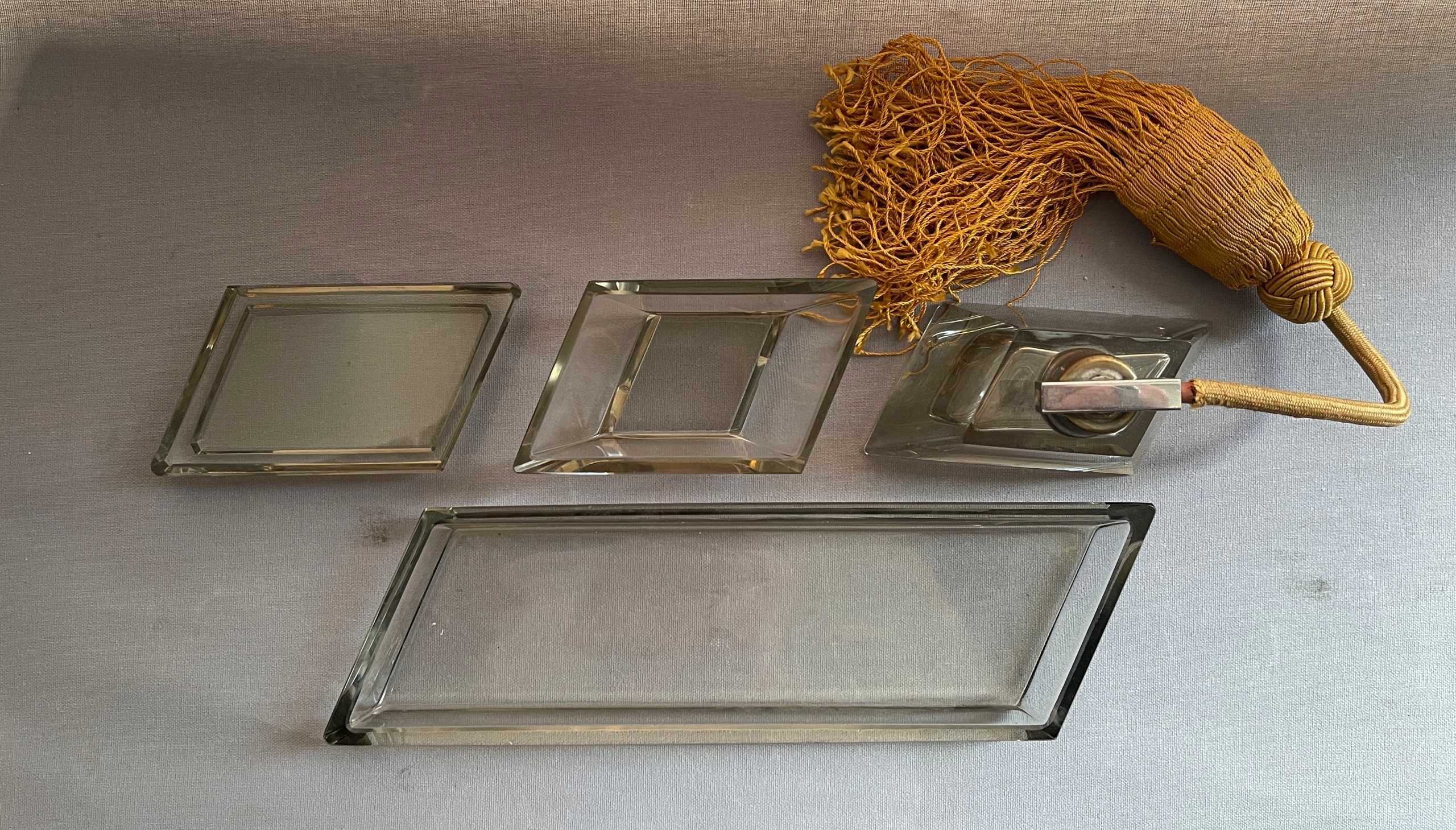 Zestaw pojemników toaletowych Art Deco - szkło ołowiowe, barwione w masie, szlifowane. Tacka o trapezowym kształcie ( wym 23,5x8 cm) z podniesionymi brzegami, pojemnik z pokrywką w kształcie trapezu ( wys.4,5 cm x 10x6,5 cm) pojemnik na wodę toaletową z pompką gumową w oplocie. Wszystkie części w bdb stanie, bez wyszczerbień, obić i rys, pompka sprawna. Wyjątkowo dobrze zachowany komplet na toaletkę damy.