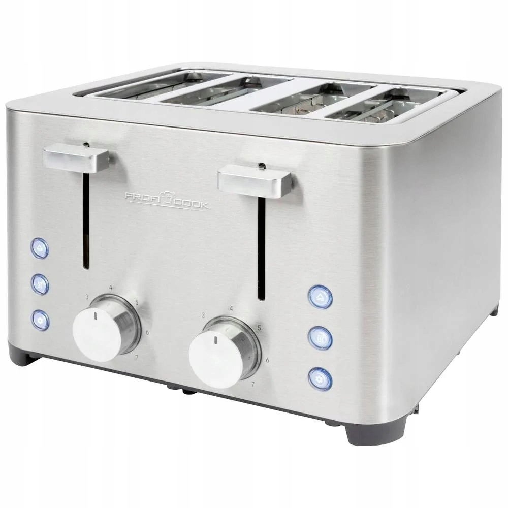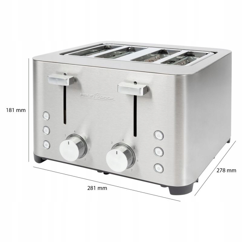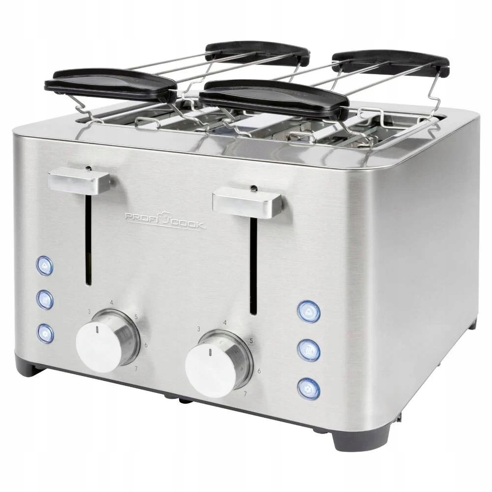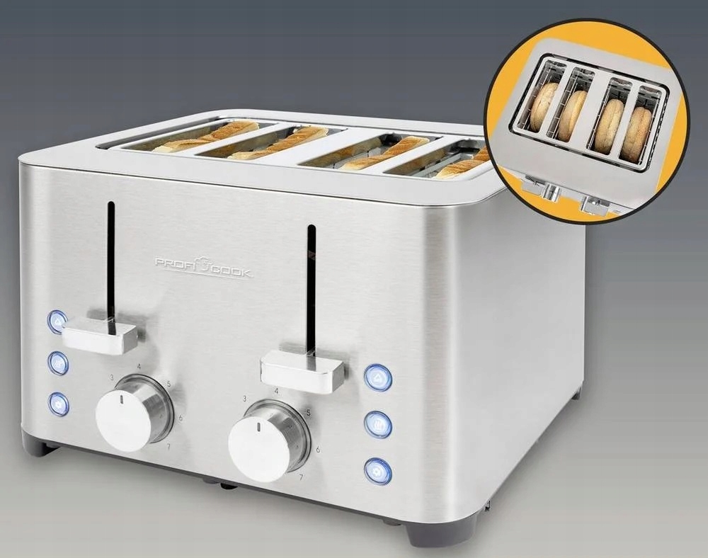 Toster na 4 kromki z obudową ze stali nierdzewnej firmy ProfiCook wyłącza się automatycznie i ręcznie. Toster z 2 nasadkami na bułki (zdejmowane) zawiera 2 tacki na okruchy (zdejmowane), zwijacz kabla i zapewnia bezpieczną podstawę dzięki gumowanym nóżkom.