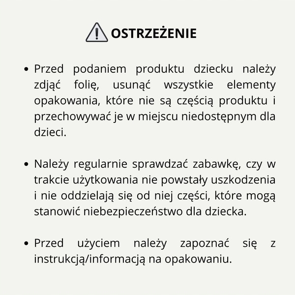 Przed podaniem produktu dziecku należy zdjąć folię, usunąć wszystkie elementy opakowania, które nie są częścią produktu i przechowywać je z miejscu niedostępnym dla dzieci.