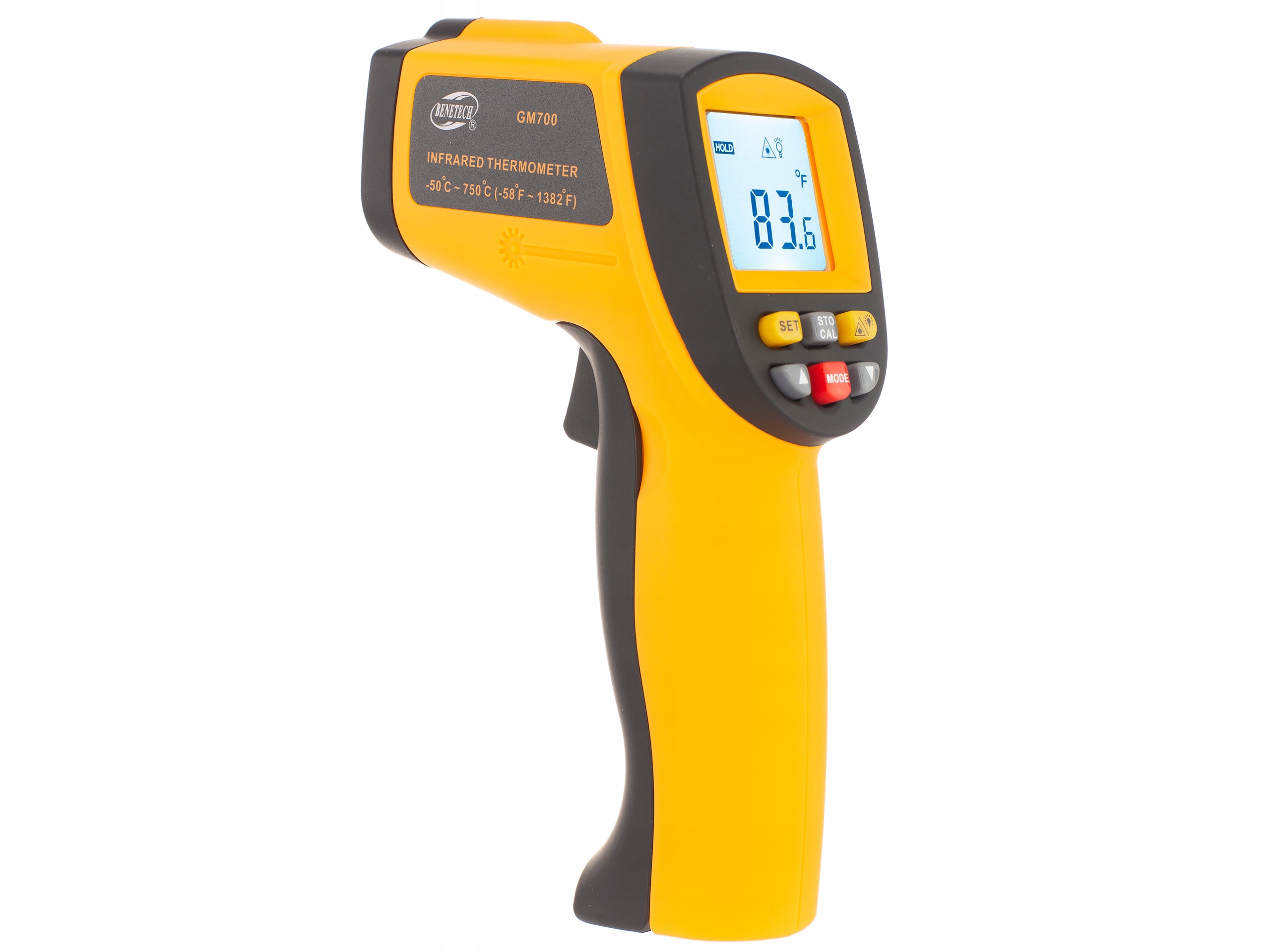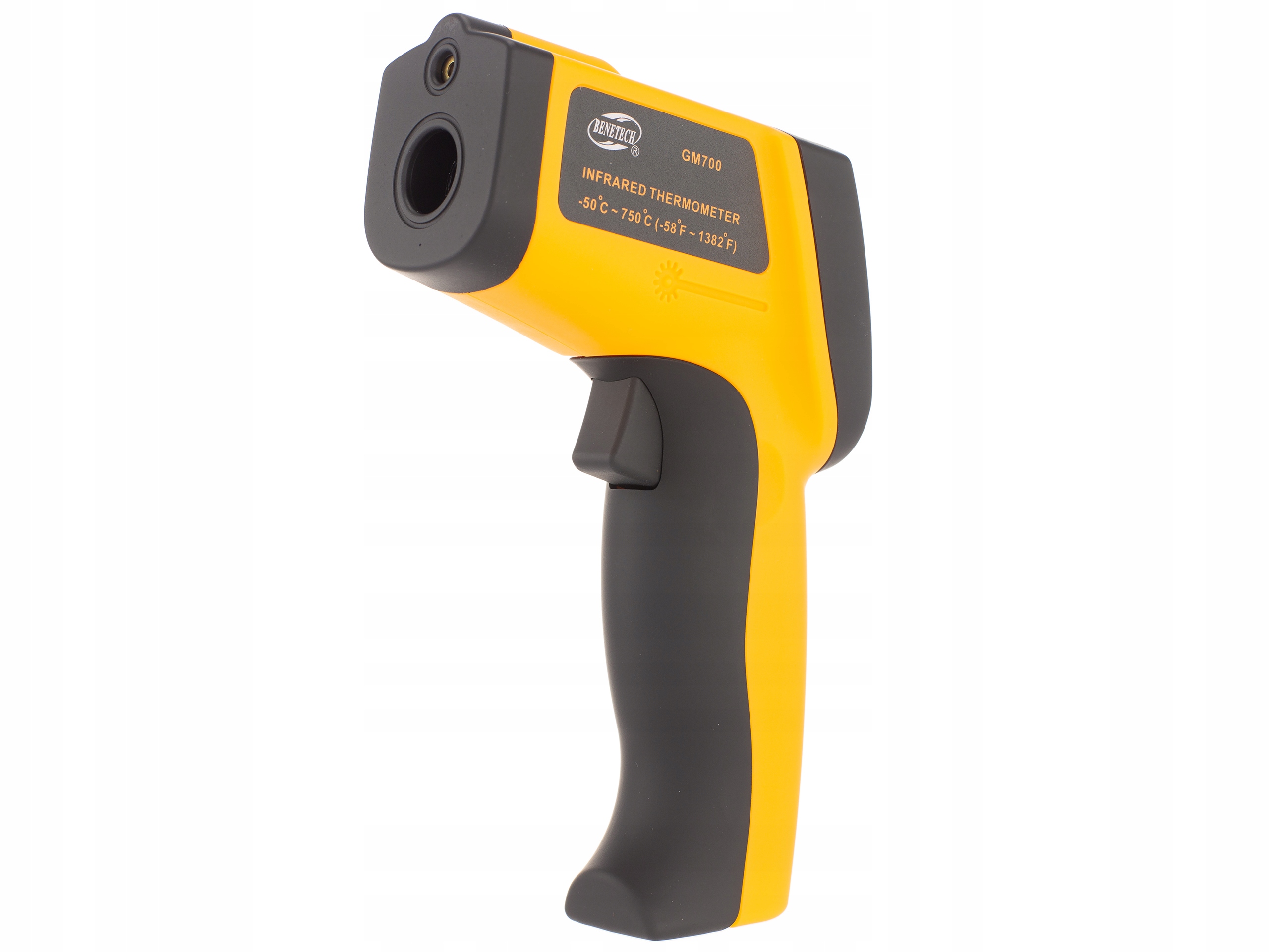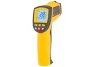 Wysokiej jakości termometr bezkontaktowy marki Benetech o zakresie temperatur od -50 do +750 °C. Urządzenie wyposażone jest w celownik laserowy, który umożliwia precyzyjne nacelowanie badanego punktu. W urządzeniu zastosowano dobrej jakości materiały, a ergonomiczna budowa poprawia wygodę użytkowania termometru. Podświetlany wyświetlacz umożliwia pracę z urządzeniem w ciemności. Pirometr wyposażony jest w funkcję automatycznego wyłączenia zwiększając oszczędność w zużyciu baterii.
