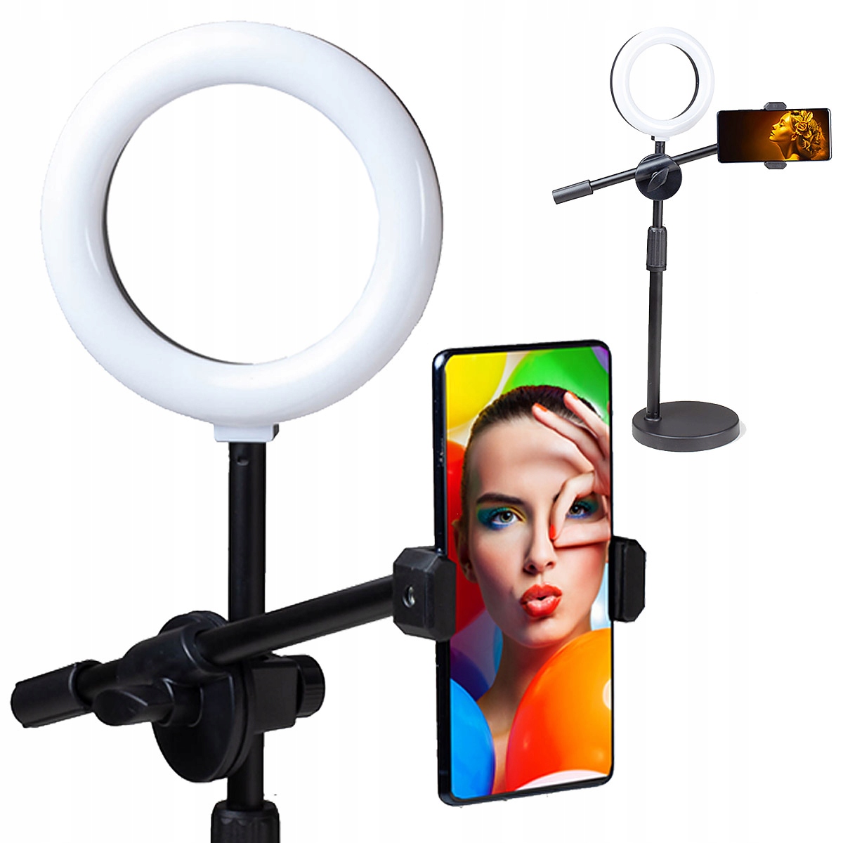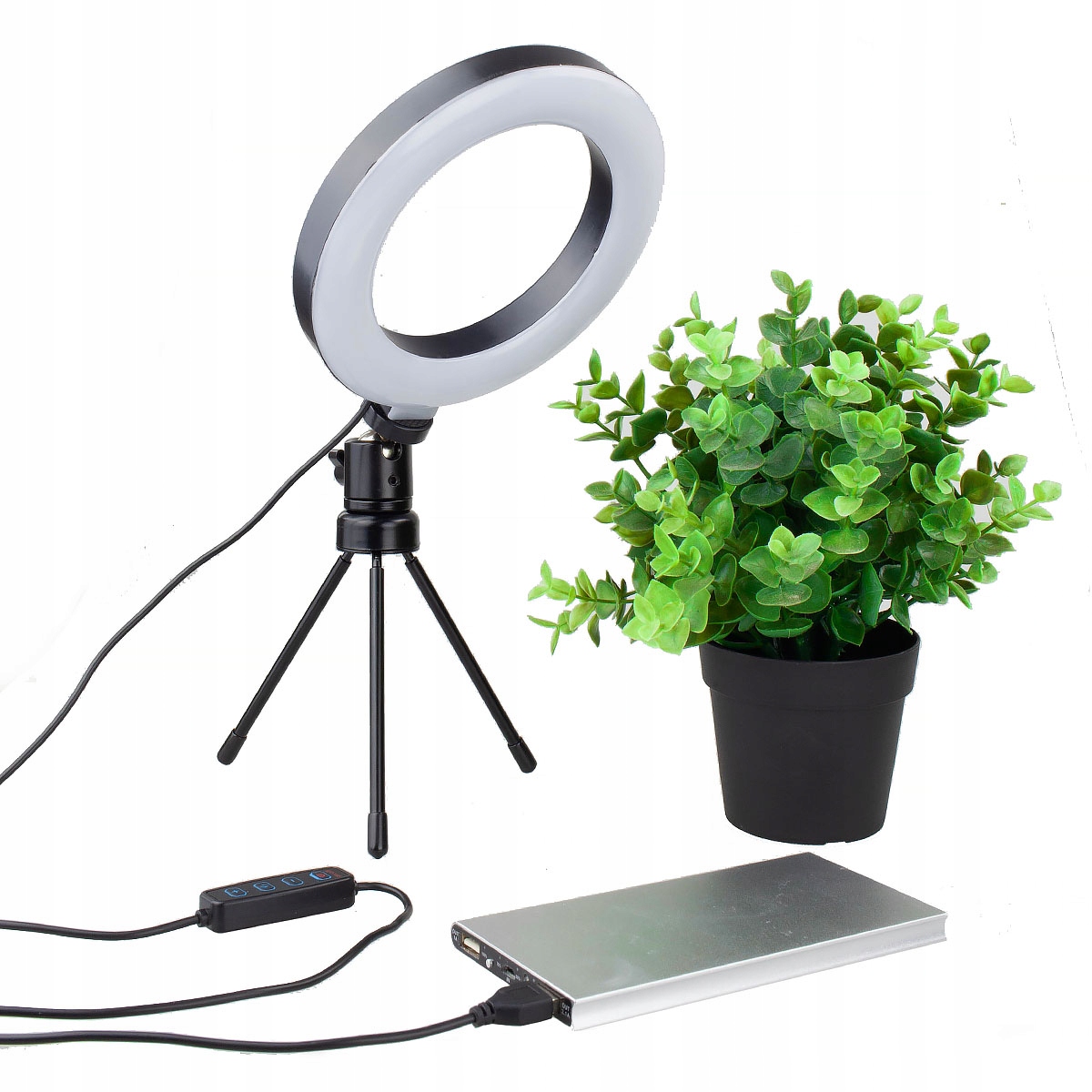 ✅ Pierścieniową lampę LEDLampa LED Bi-Color z wygodną regulacją jasności i temperatury barwowej za pomocą mini-pilota umieszczonego na przewodzie zasilającym USB.