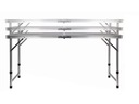Składany stolik turystyczny ma aluminiową ramę, co zapewnia lekkość i wytrzymałość. Na ramie znajduje się blat wykonany z trwałego i łatwego w czyszczeniu tworzywa sztucznego.