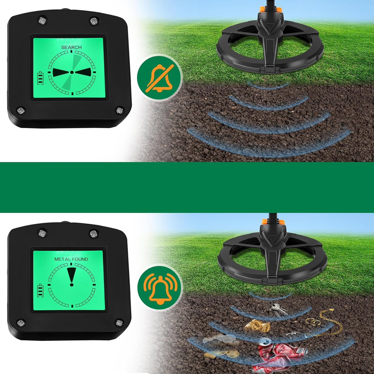 ⏩ ⏩【ЖК-дисплей и звук】: сообщение акустический и светодиодный индикатор указывают на обнаружение металла. При обнаружении металла на ЖК-экране отображается есть сообщение "металл найден" и звуковой сигнал. Чем ближе они, тем громче звучит и сигнал он становится сильнее. ЖК-дисплей показывает уровень заряда батареи и сообщает вам, когда заменить ее.