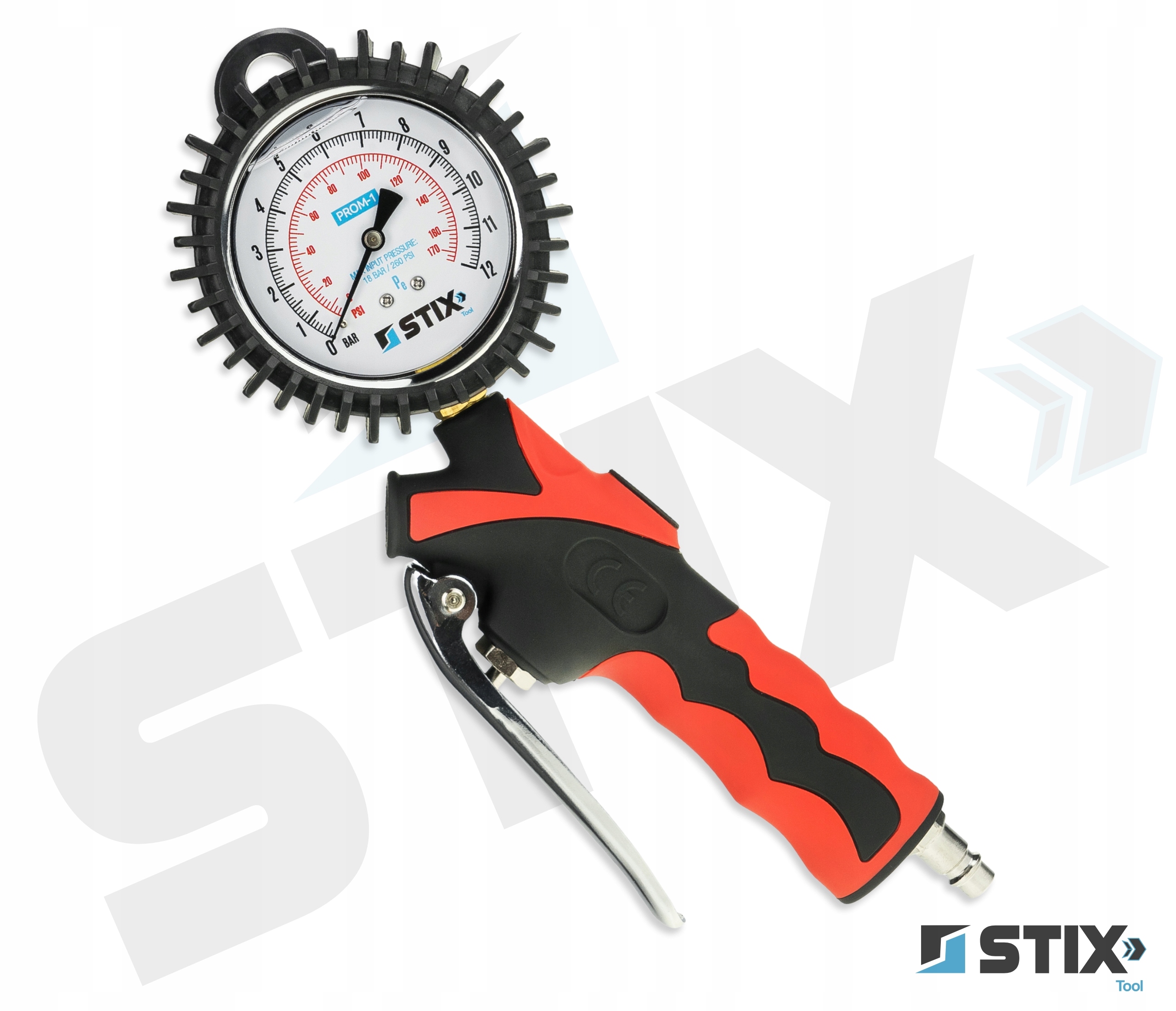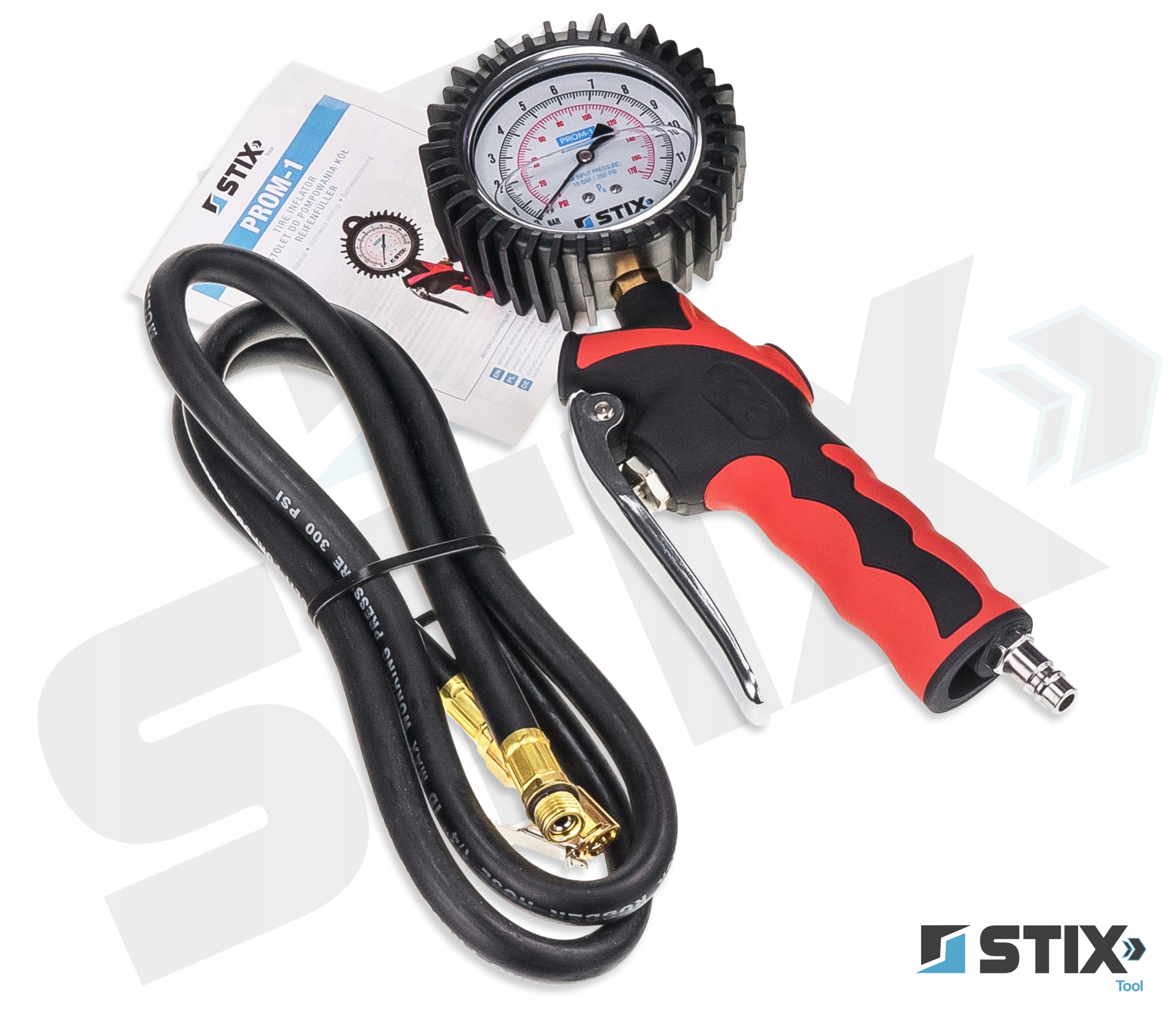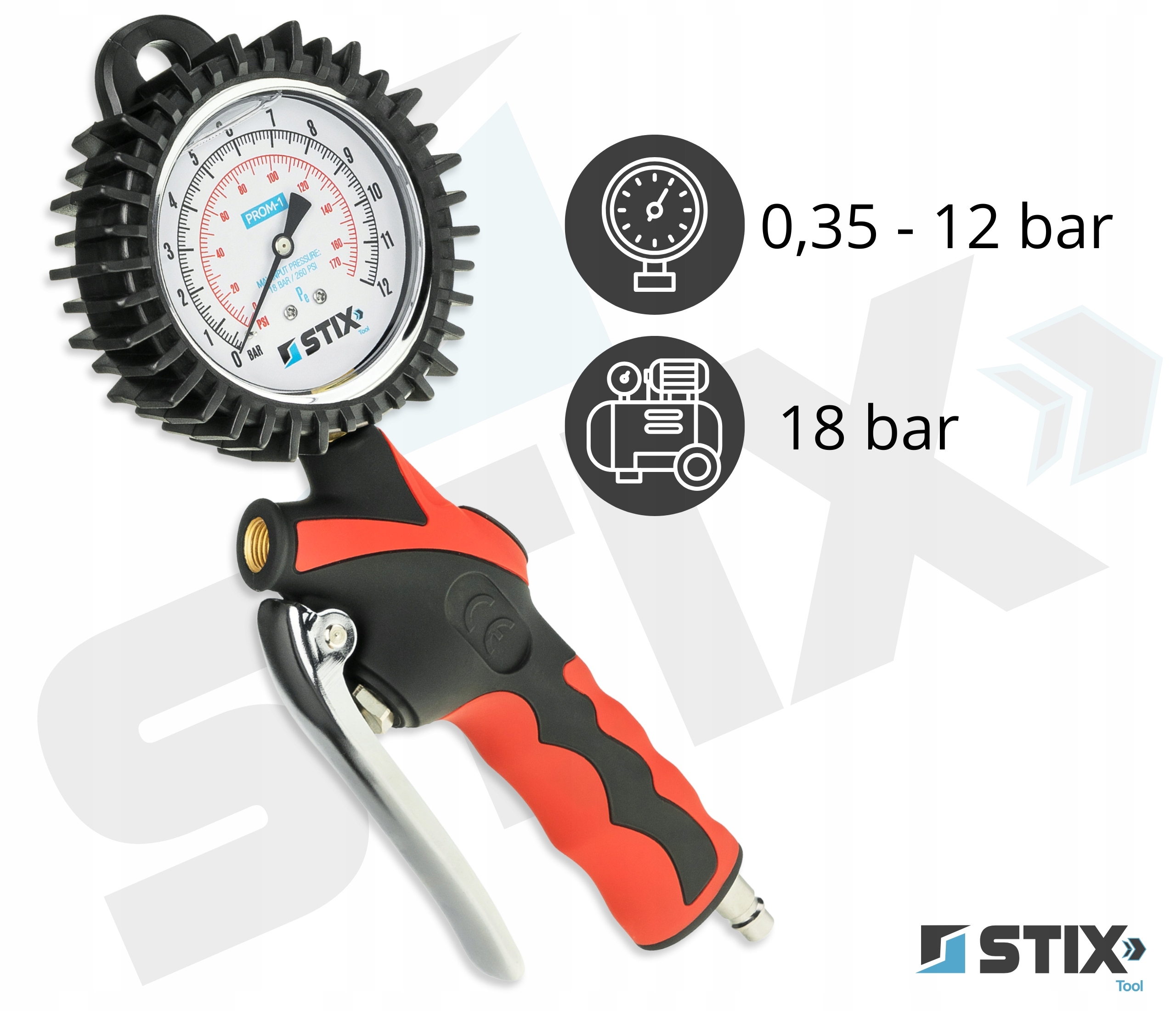PROM-1 marki Stix Tool to klasyczny pistolet do pompowania kół, wyposażony w niezawodny manometr analogowy. Zapewnia szybką kontrolę ciśnienia, wysoką odporność na uszkodzenia oraz prostą obsługę bez potrzeby zasilania. Sprawdzi się w warsztacie, serwisie i garażu.